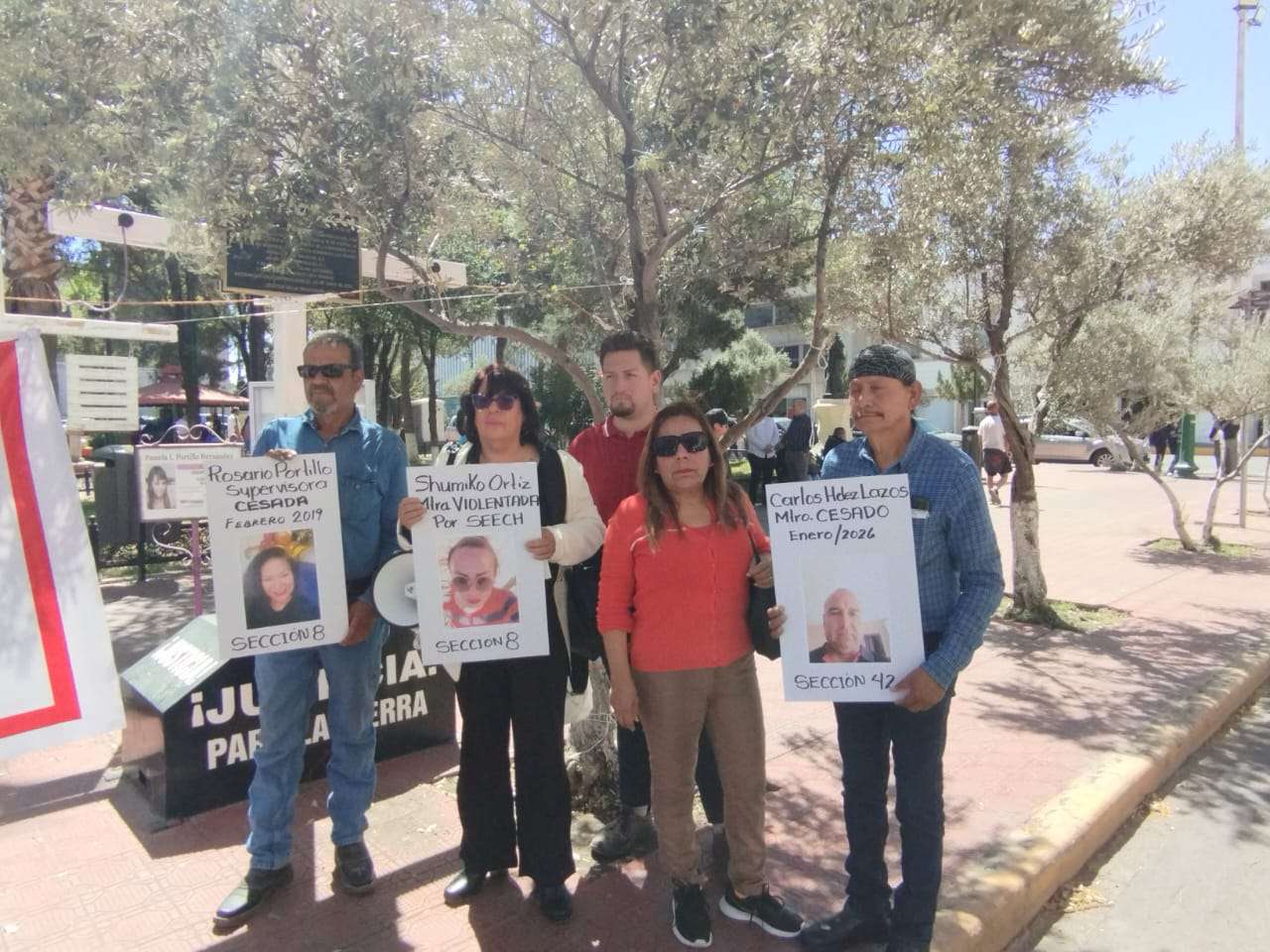 Chihuahua.– Miembros del Sindicato Nacional de Trabajadores de la Educación (SNTE), de las secciones 8 y 42, se manifestaron frente a Palacio de Gobierno, donde expresaron diversas quejas contra autoridades educativas, entre ellas ceses laborales y presunta violencia laboral.