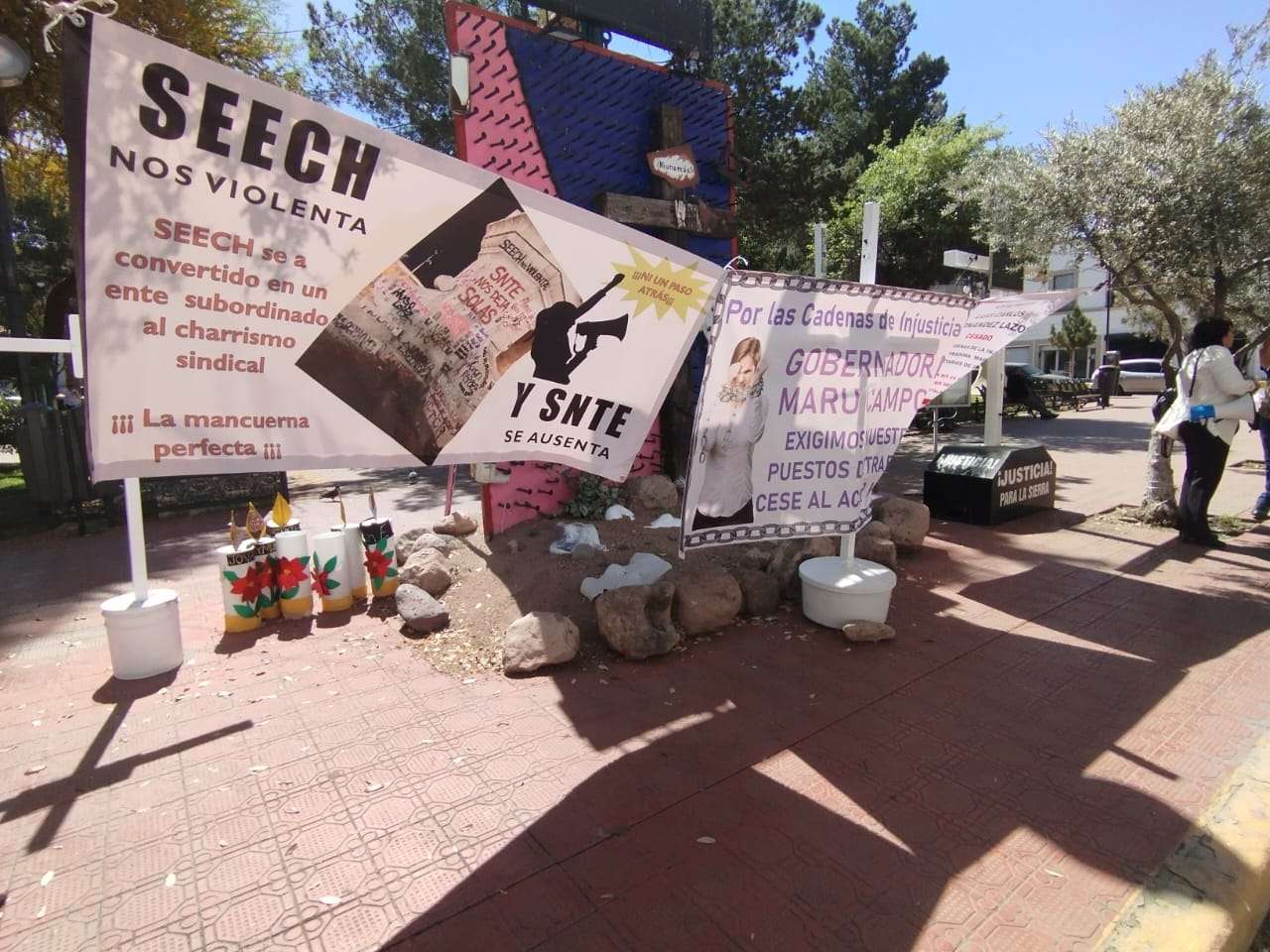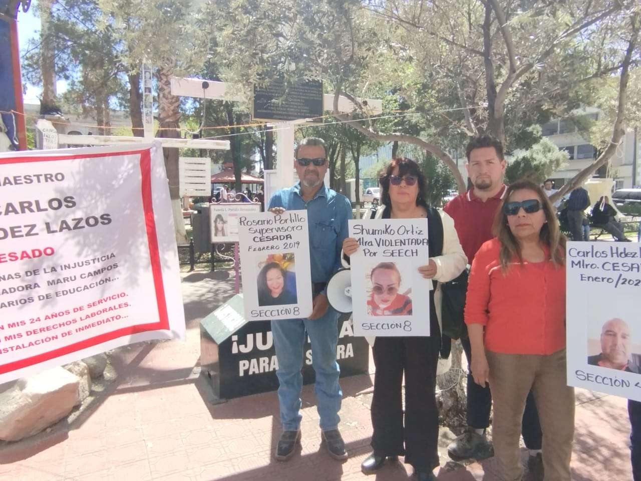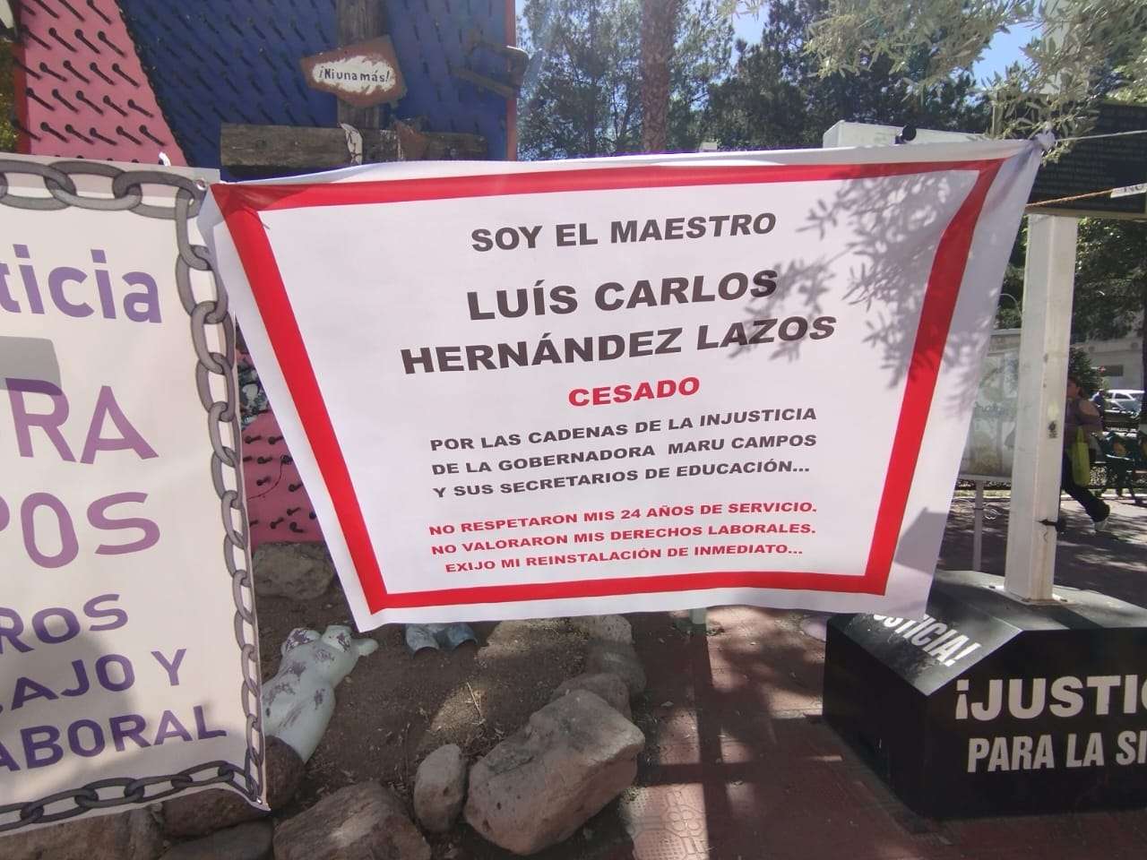 “Aquí está la verdadera realidad. Aquí están los maestros cesados. Hay un maestro con 18 años cesado, el maestro Tomás Ortiz. Hay una supervisora de Ciudad Juárez con nueve años cesada. No hay respuesta de este gobierno, por eso estamos aquí”, expresó Cardona Muñoz, quien además invitó a otros docentes a compartir sus testimonios.