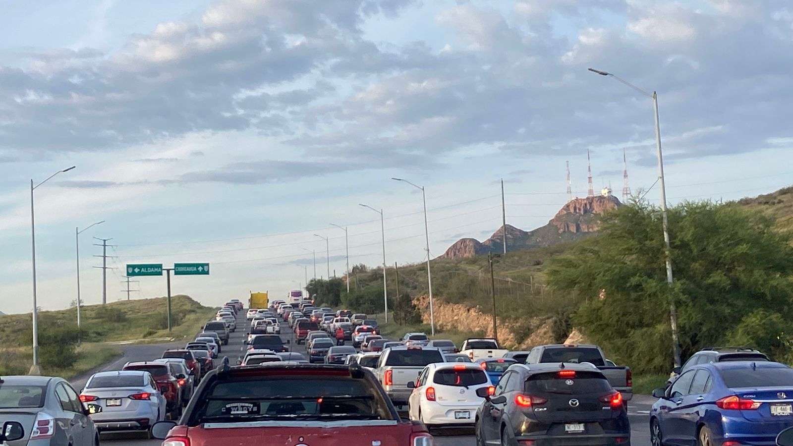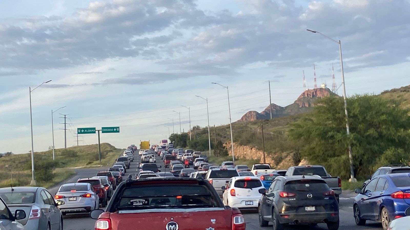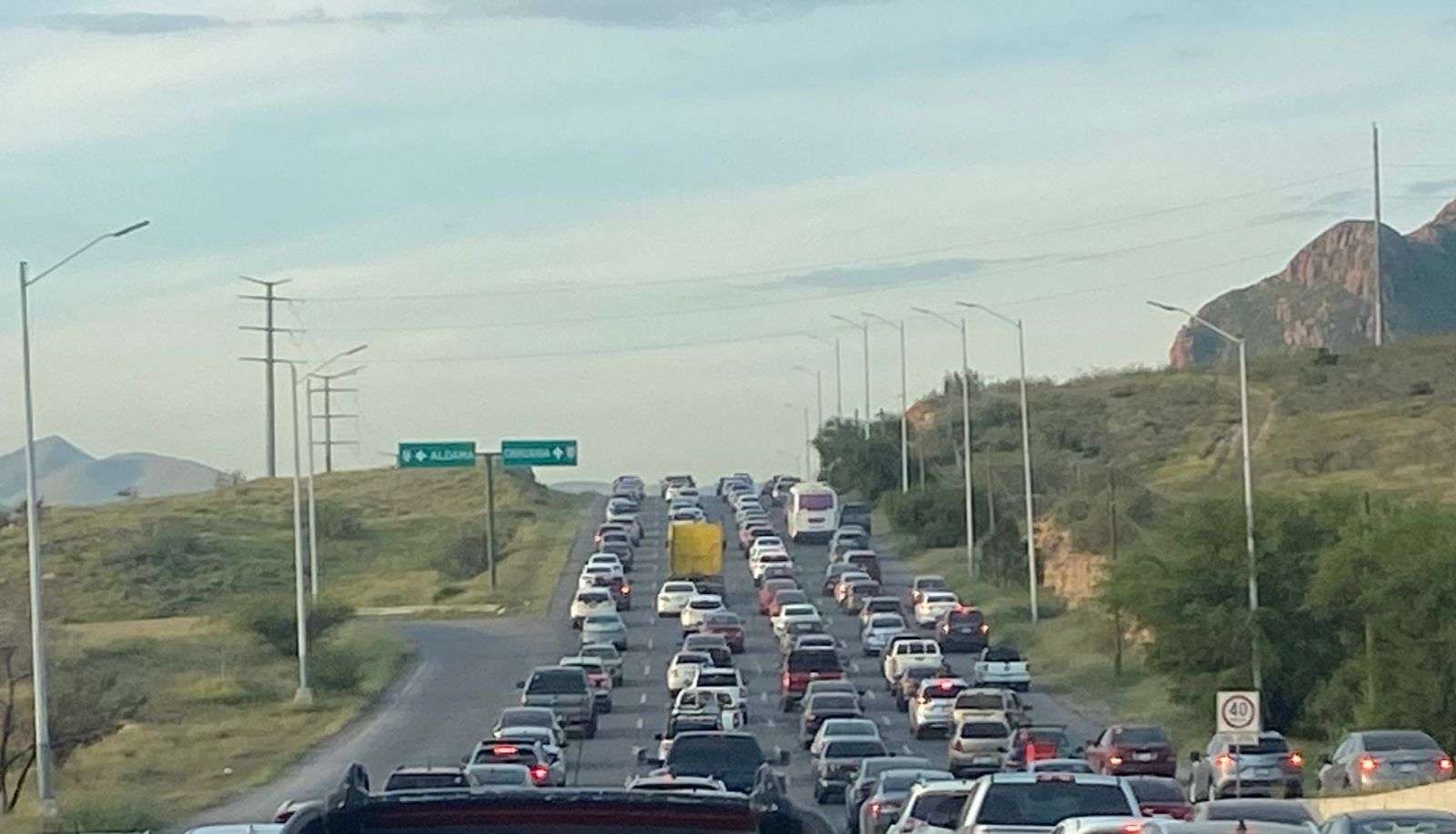 Chihuahua.- Gran Caos vial se presentó en la carretera a Aldama, las filas lde vehículos llegaban hasta el puente vehicular de Romanza, por lo que los automovilistas buscan lanera de cruzar de manera rápida por la zona.