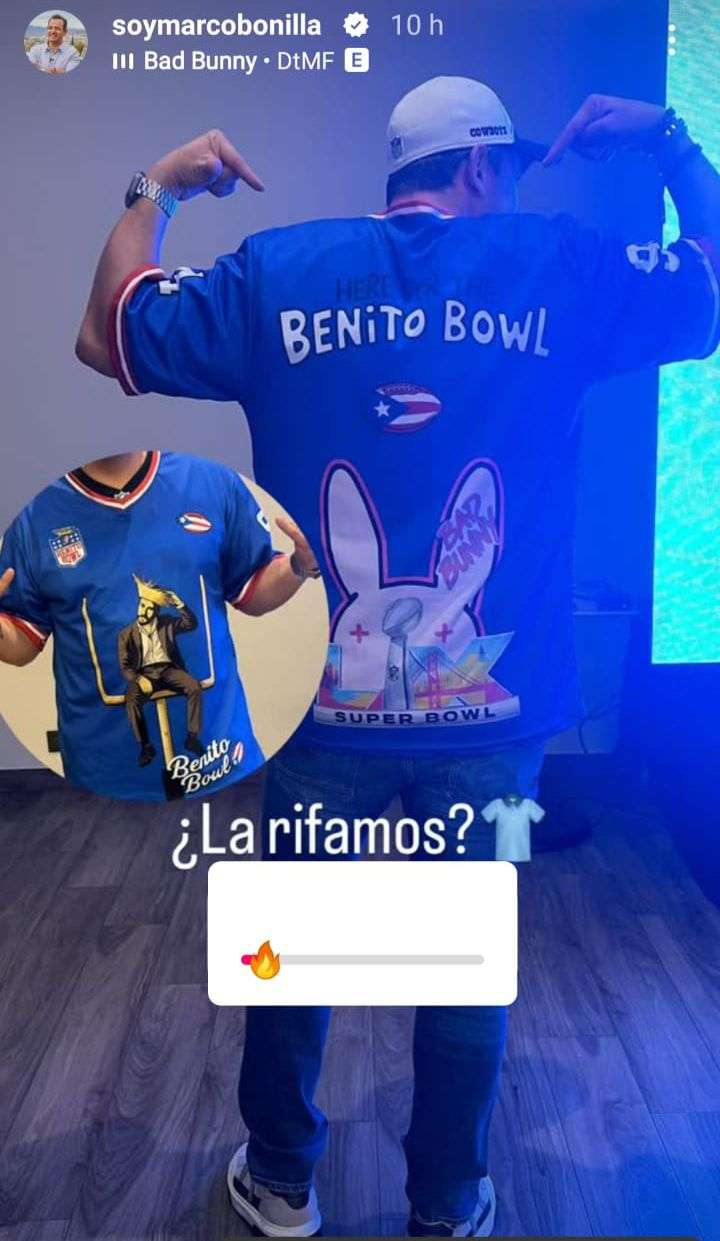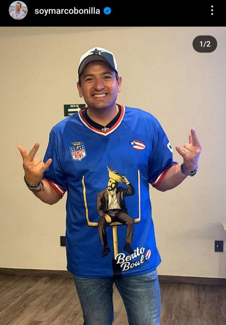 El alcalde Marco Bonilla apareció con un jersey en tono azul que incluye la imagen de Bad Bunny, un ovoide con la bandera de Puerto Rico y el escudo del Benito Bowl, y complementó su atuendo con una gorra de los Dallas Cowboys, equipo del que es aficionado.