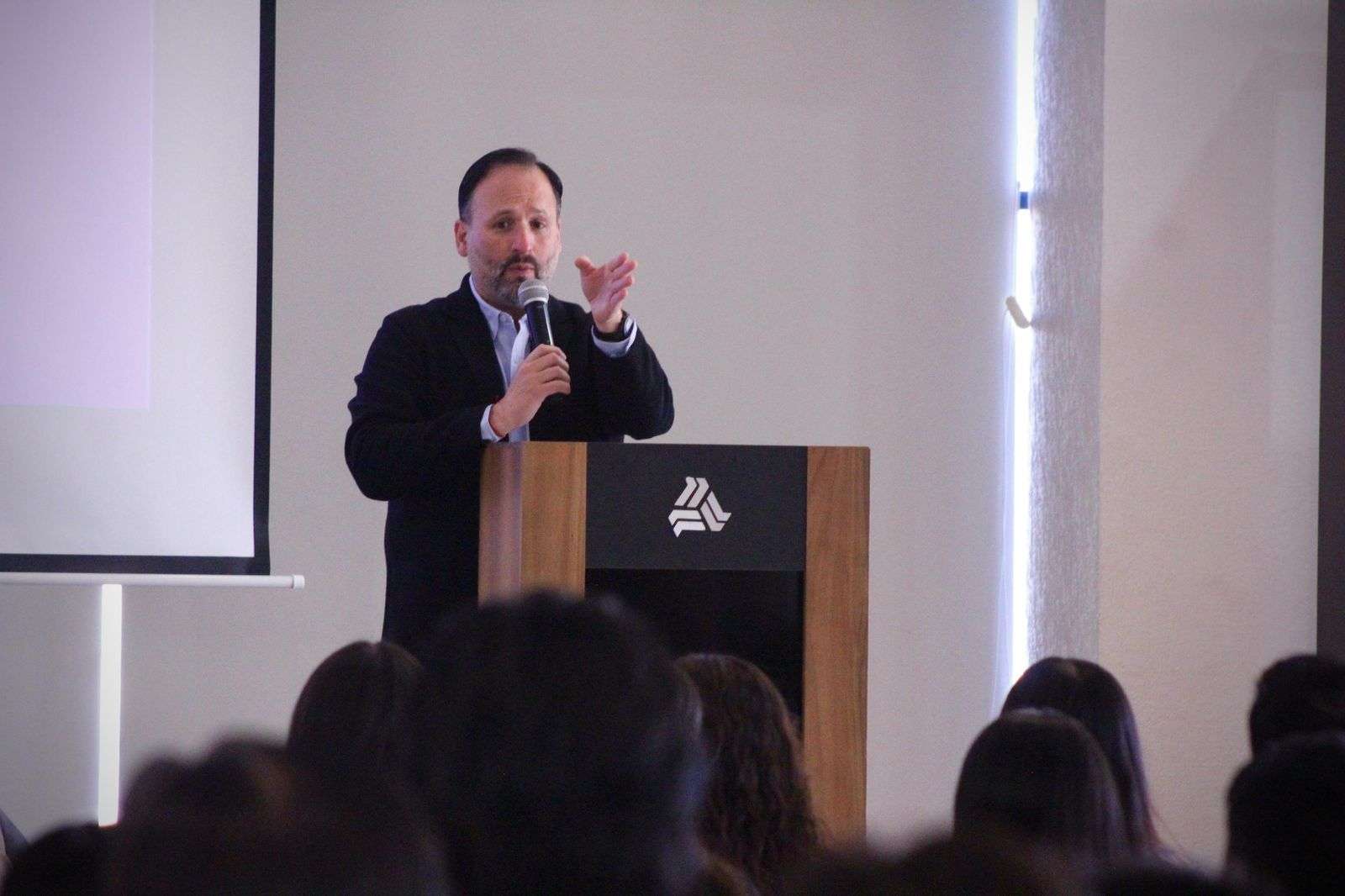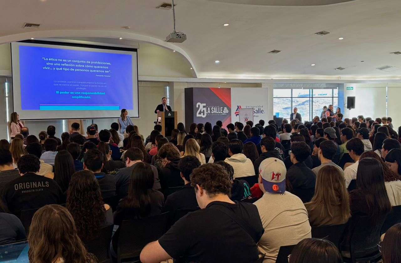 Chihuahua.- En el marco del “Mes de la Ética 2026 organizado por Phi Delta Phi” en la Universidad La Salle Chihuahua, el Secretario General de Gobierno, Santiago De la Peña, tuvo la oportunidad de sostener encuentro con más de 200 estudiantes de diferentes carreras, principalmente de la licenciatura de Derecho donde habló de la importancia de ejercer el poder con ética y responsabilidad, con la conferencia denominada ¿Cómo se toman las decisiones en el poder”.