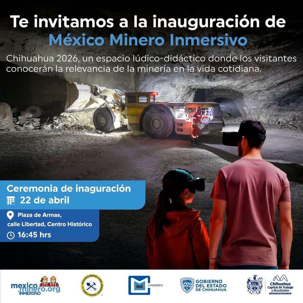 Chihuahua.- En el corazón del Centro Histórico fue inaugurada la muestra interactiva "México Inmersivo", una exposición lúdico-didáctica que bajo el eslogan "Todo tiene un inicio. Todo inicia con la minería", busca acercar a la ciudadanía a la realidad de este sector estratégico.