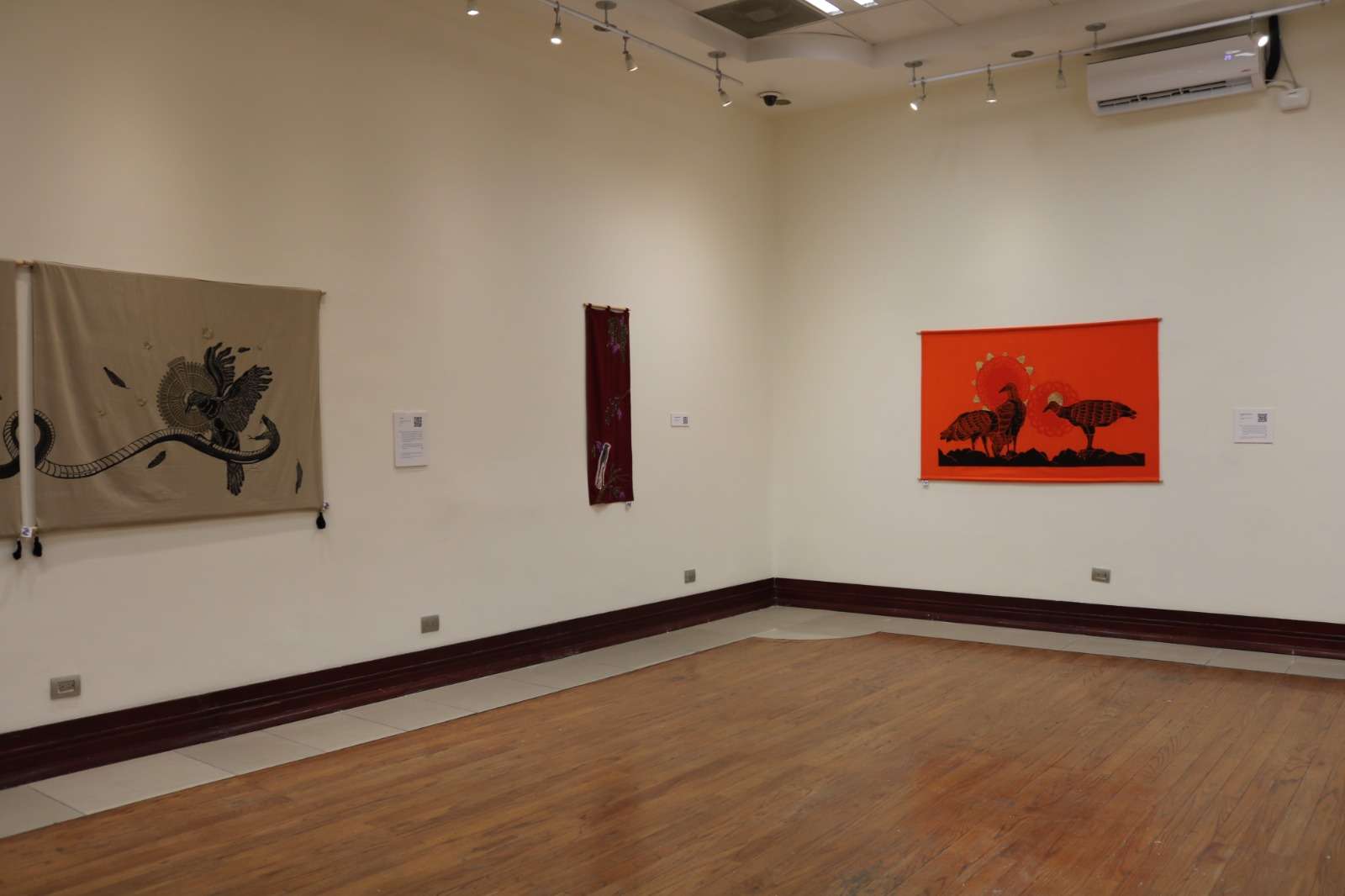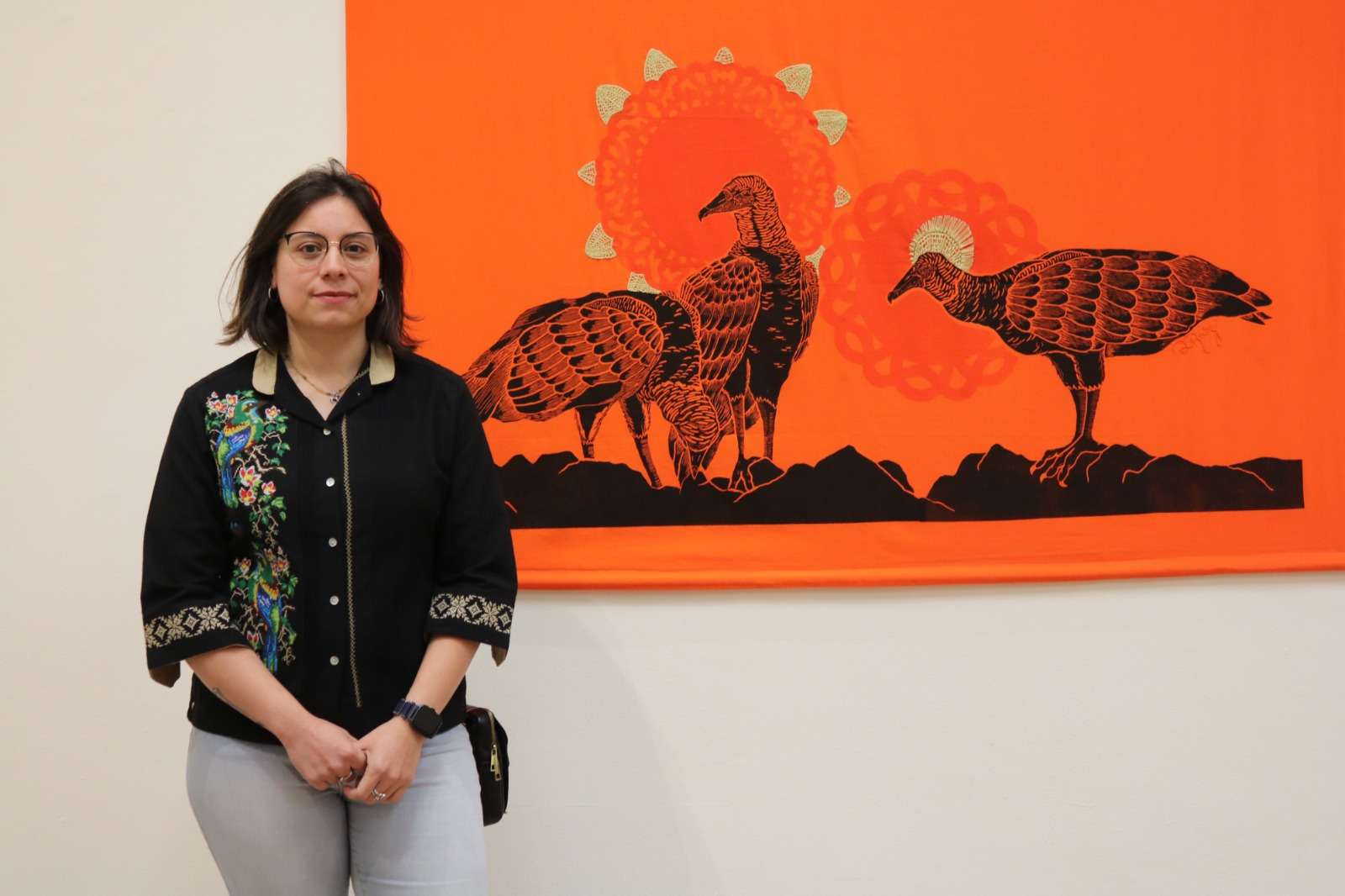 La exhibición reúne 17 obras de arte textil intervenidas con las técnicas de linografía y bordado, a través de las cuales, la autora representa diversas aves endémicas de México y explora su profundidad simbólica, al relacionarlas con el pasado prehispánico y colonial del país.