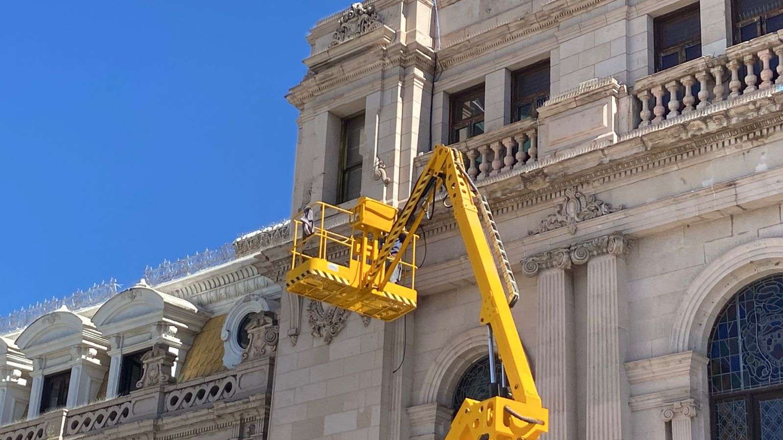 Con el apoyo de una grúa, los empleados colocaron varios metros de cable de uso rudo en la parte frontal del edificio, lo que permitirá conectar las nuevas luminarias.