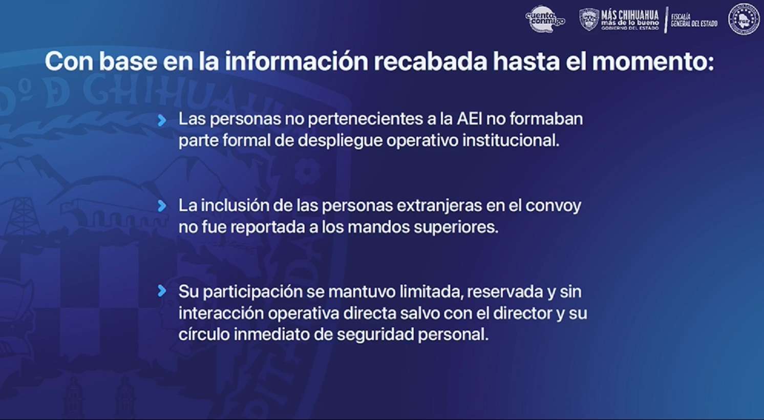 Chihuahua.- La encargada de la Unidad Especializada para la Investigación de los Hechos del Narco Laboratorio en Morelos, Wendy Chávez Villanueva, presentó una actualización detallada sobre las investigaciones del operativo en el municipio de Morelos, revelando que el fallecido director de la Agencia Estatal de Investigación (AEI), Pedro Román Oseguera Cervantes, integró a cuatro ciudadanos estadounidenses al convoy oficial de manera reservada y sin autorización de sus superiores y, por tanto, no actuaron en disposición de mando, coordinación ni ejecución de actos de autoridad.