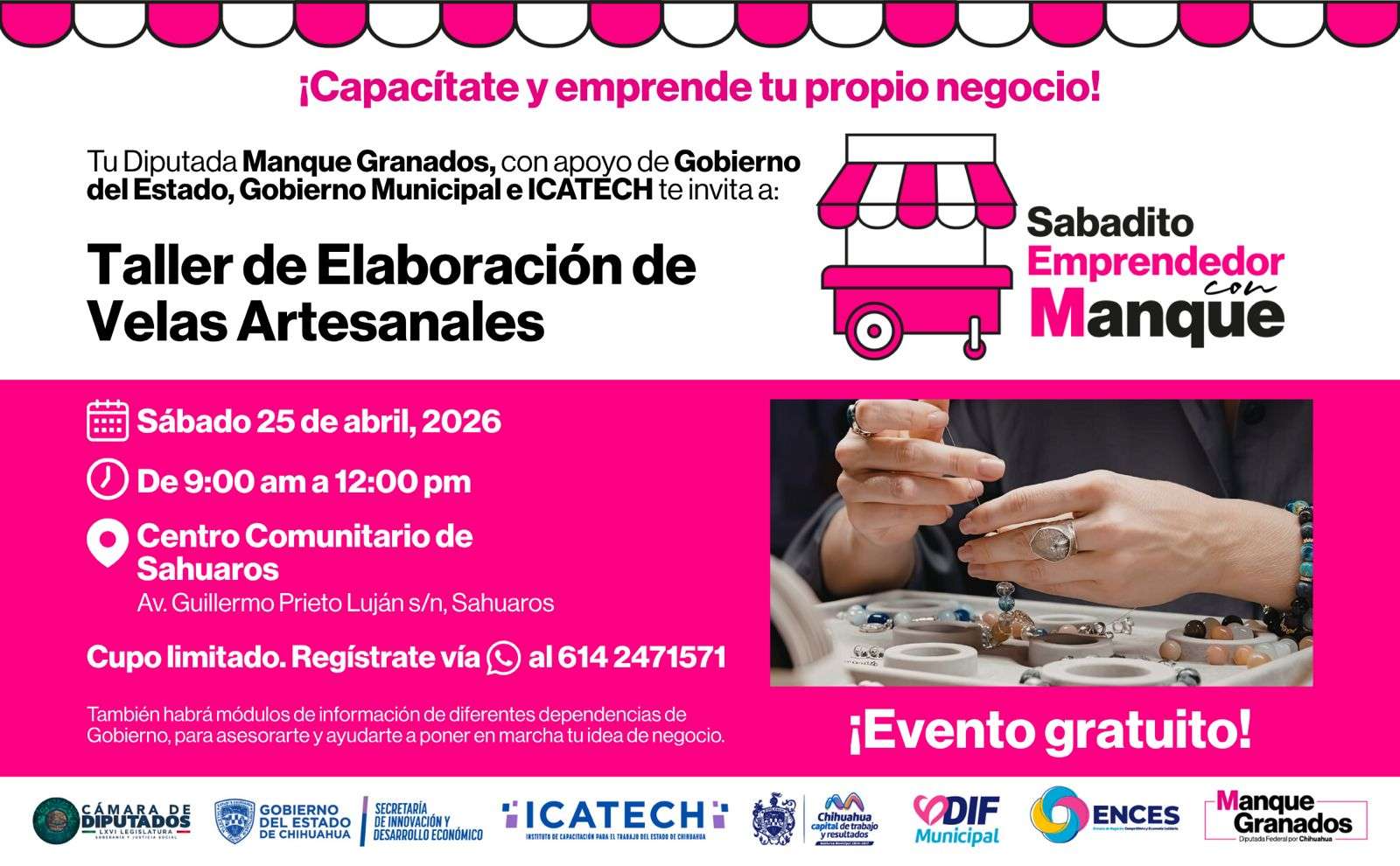 Chihuahua.- Con el objetivo de impulsar el emprendimiento y fortalecer la economía familiar en Chihuahua Capital, la diputada federal Manque Granados invita a los vecinos de Sahuaros, El Porvenir, y colonias aledañas, a la cuarta edición del programa “Sabadito Emprendedor”, que ofrecerá una capacitación gratuita de elaboración de velas artesanales.