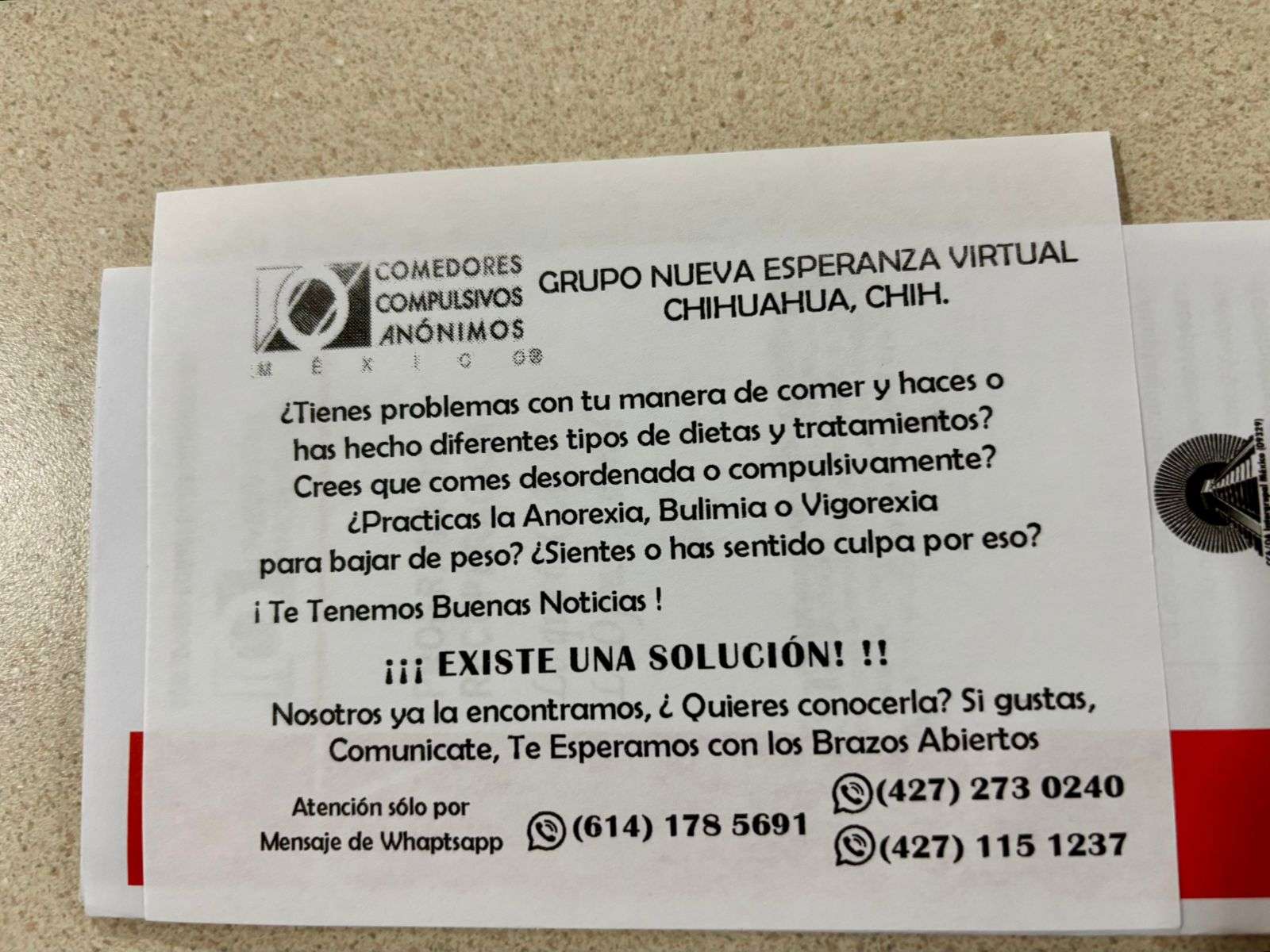 Chihuahua.- Comedores Compulsivos Anónimos, es una agrupación que inició en 1960, en Los Ángeles California, por la fundadora Rozanne S.