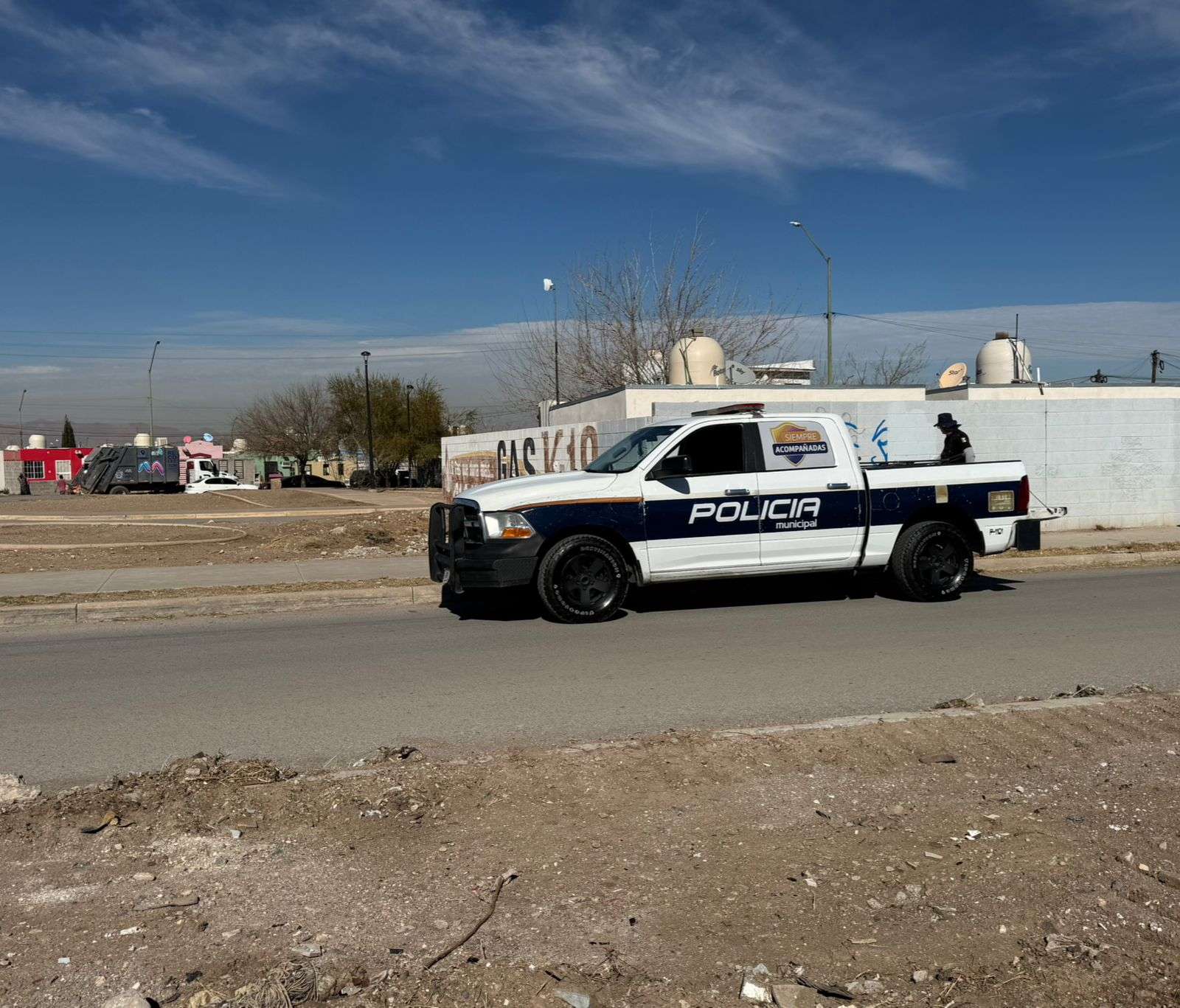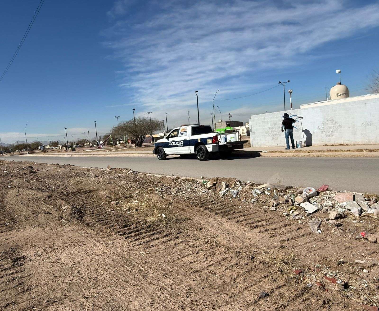 Chihuahua.- Un elemento de la Policía Municipal fue captado mientras realizaba labores de limpieza y reparación de grafitis en la colonia Punta Oriente, específicamente en la intersección de Prolongación R. Almada y calle Punta la Angostura.