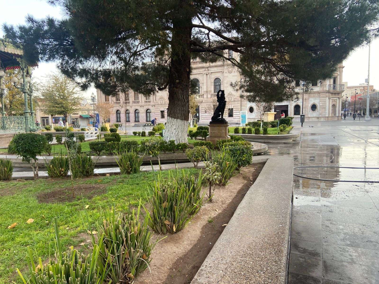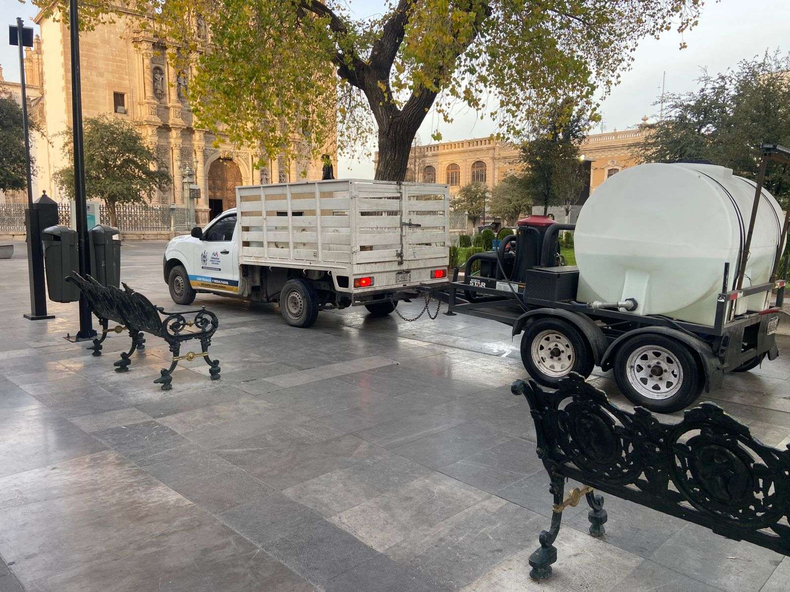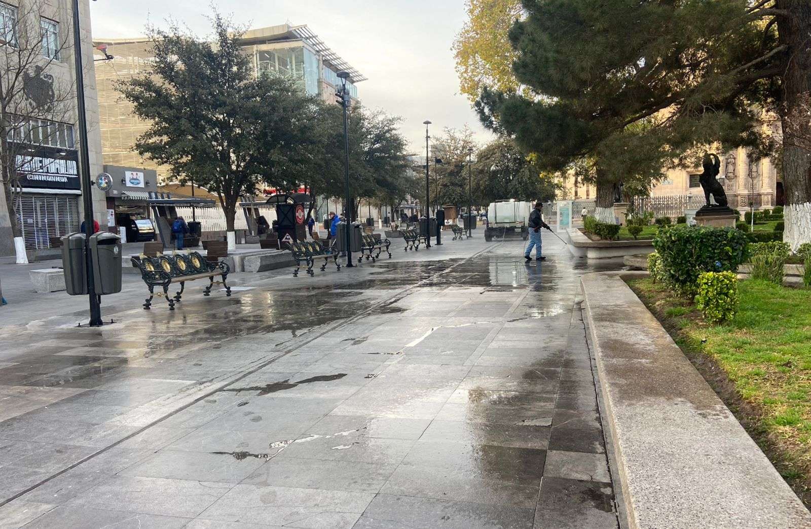Chihuahua.– Una cuadrilla de trabajadores de la Dirección de Mantenimiento Urbano llevó a cabo labores de limpieza en la Plaza de Armas, específicamente en las calles Libertad y Victoria, con el objetivo de mantener en buen estado la imagen del centro histórico de la ciudad.