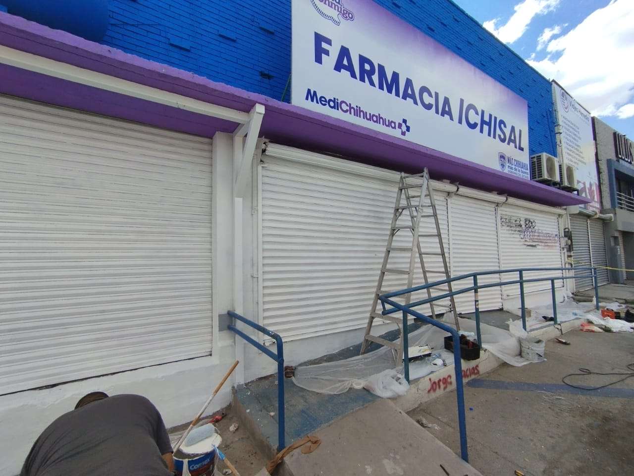 Chihuahua.- Personal de mantenimiento se presentó la tarde de este domingo en las instalaciones de la farmacia del Instituto Chihuahuense de la Salud (ICHISAL), ubicada en la Avenida Universidad, para realizar labores de limpieza y pintura en la fachada que resultó graffiteada durante la marcha del pasado 8 de marzo.