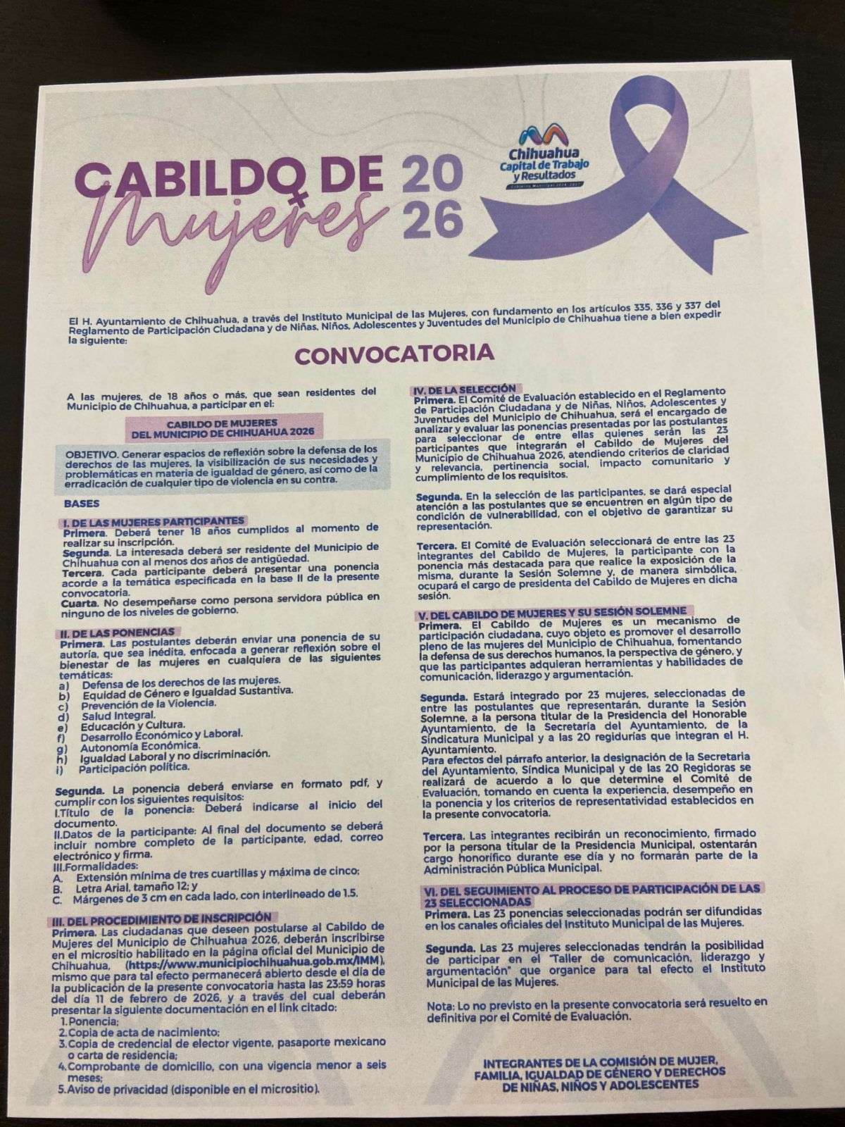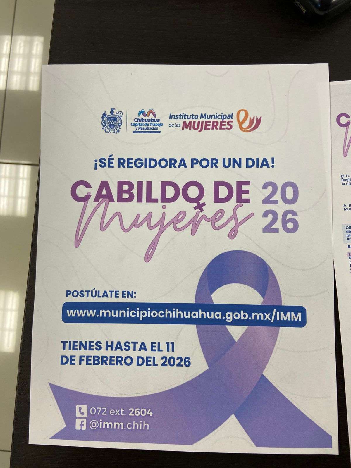 Chihuahua.- Las regidoras del municipio de Chihuahua en conjunto con el Instituto Municipal de las Mujeres, invitaron a participar en la convocatoria para ser regidora por un dia en el Cabildo de Mujeres 2026, para poder darle espacio y voz a las mujeres que más lo necesitan.