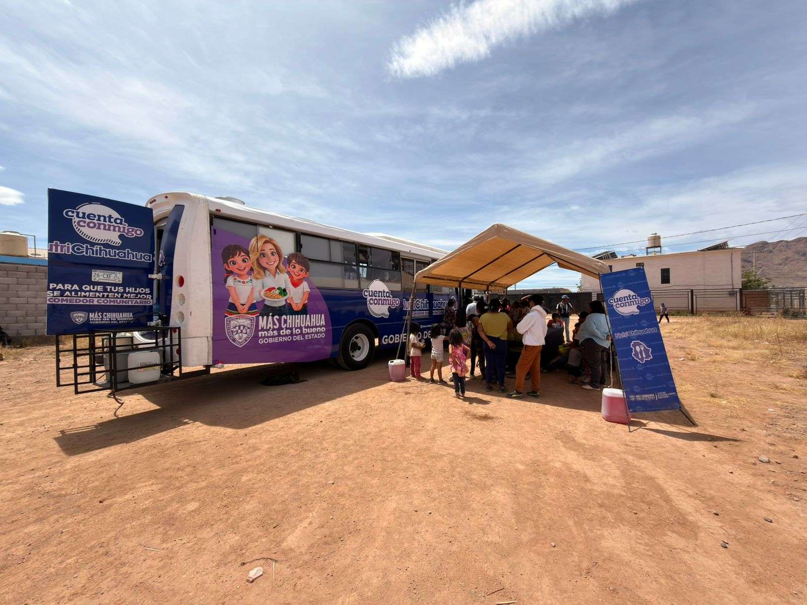 Chihuahua. - El Gobierno del Estado, a través de la Secretaría de Desarrollo Humano y Bien Común (SDHyBC), llevó el comedor móvil de NutriChihuahua a más colonias de la capital, para la distribución de platillos calientes a la población.