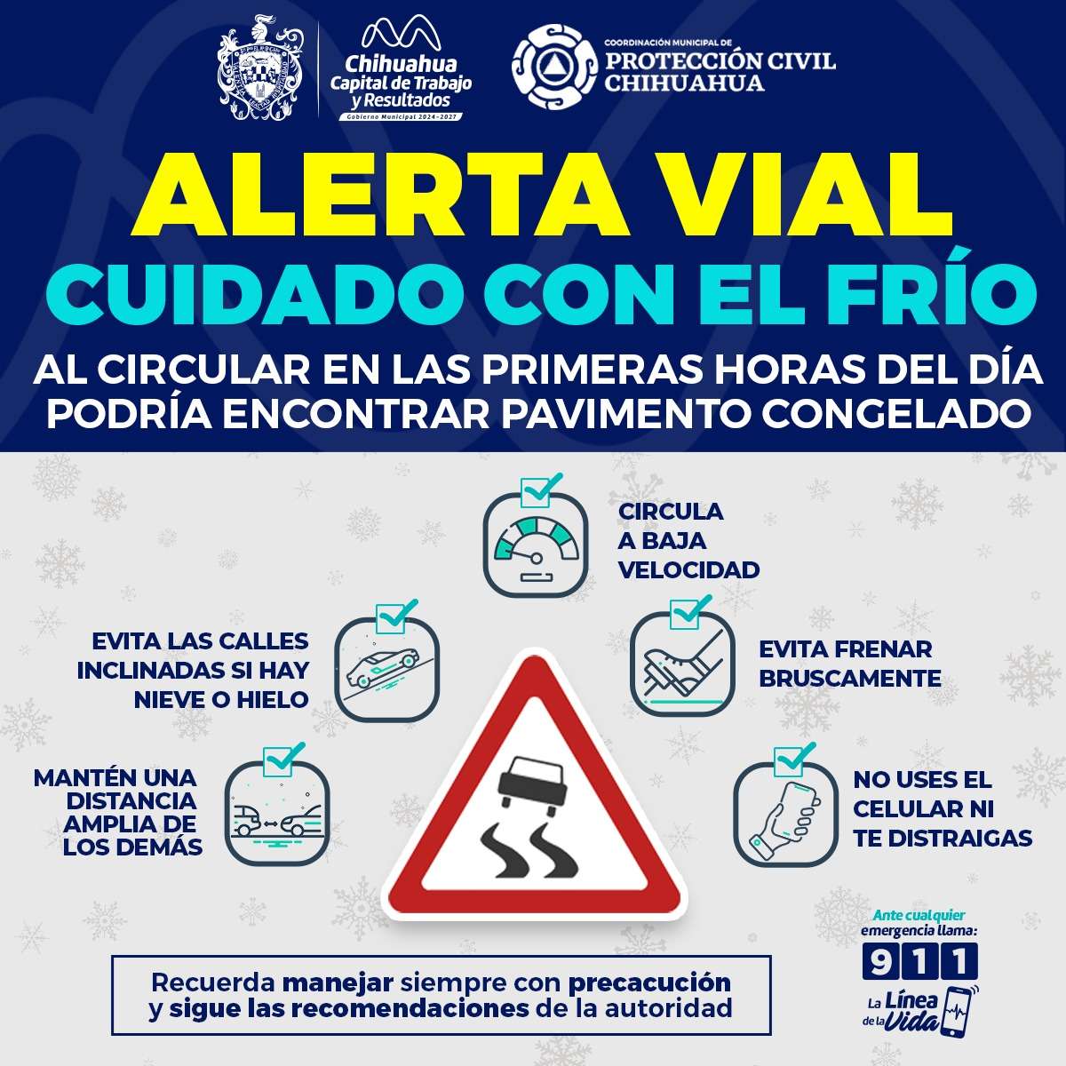 Chihuahua. - El Gobierno Municipal de Chihuahua a través de la Coordinación Municipal de Protección Civil, informa que para el día lunes por la mañana existe la probabilidad de precipitaciones de nieve o aguanieve, por lo que exhorta a la ciudadanía a conducir con precaución ante un congelamiento del pavimento.