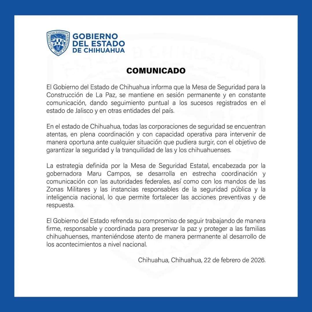 El Gobierno del Estado refrenda su compromiso de seguir trabajando de manera firme, responsable y coordinada para preservar la paz y proteger a las familias chihuahuenses, manteniéndose atento de manera permanente al desarrollo de los acontecimientos a nivel nacional.