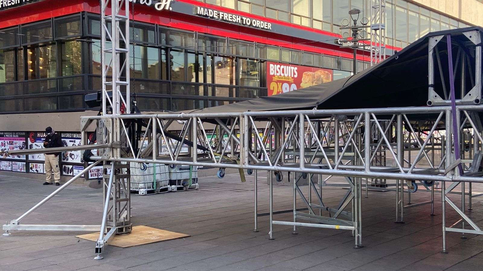 Se trata de un pequeño escenario, con un templete y una carpa que estará albergando a los grupos de danza que estarán participando en este evento.