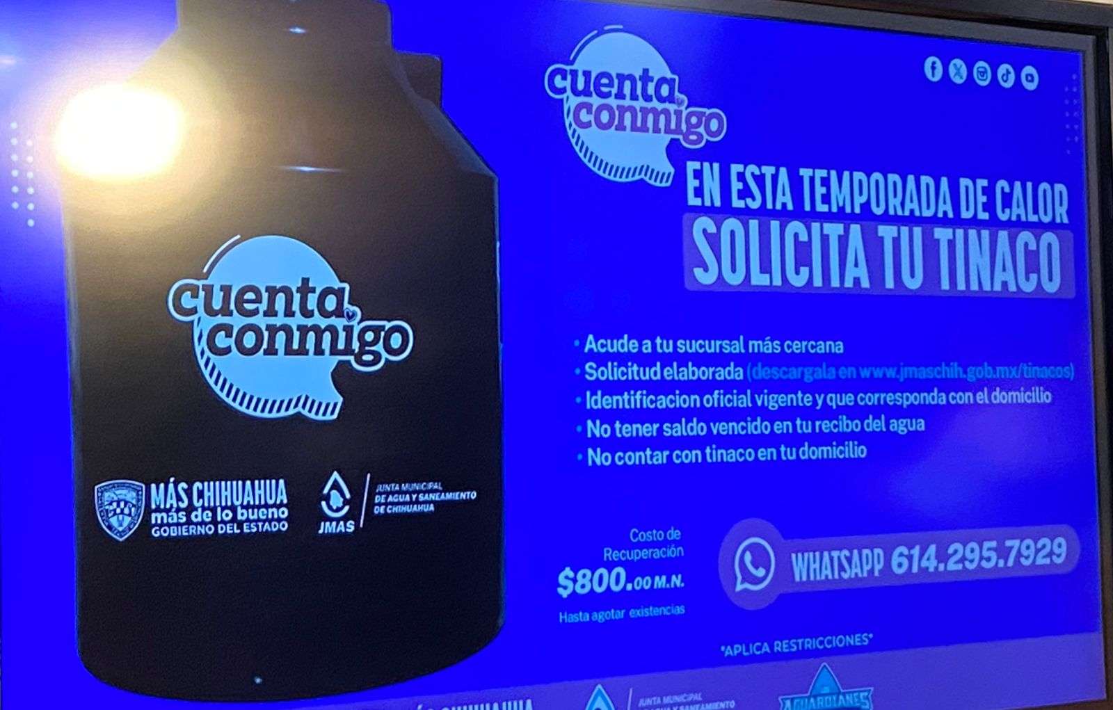Señaló, que para solicitar el tinaco debe de llenar una solicitud en fisico que puede solicitar en cualquier sucursal de la Jmas o se puede descargar en la liga www.jmaschih.gob.mx/tinacos, identificación oficial vigente que corresponda con el domicilio.