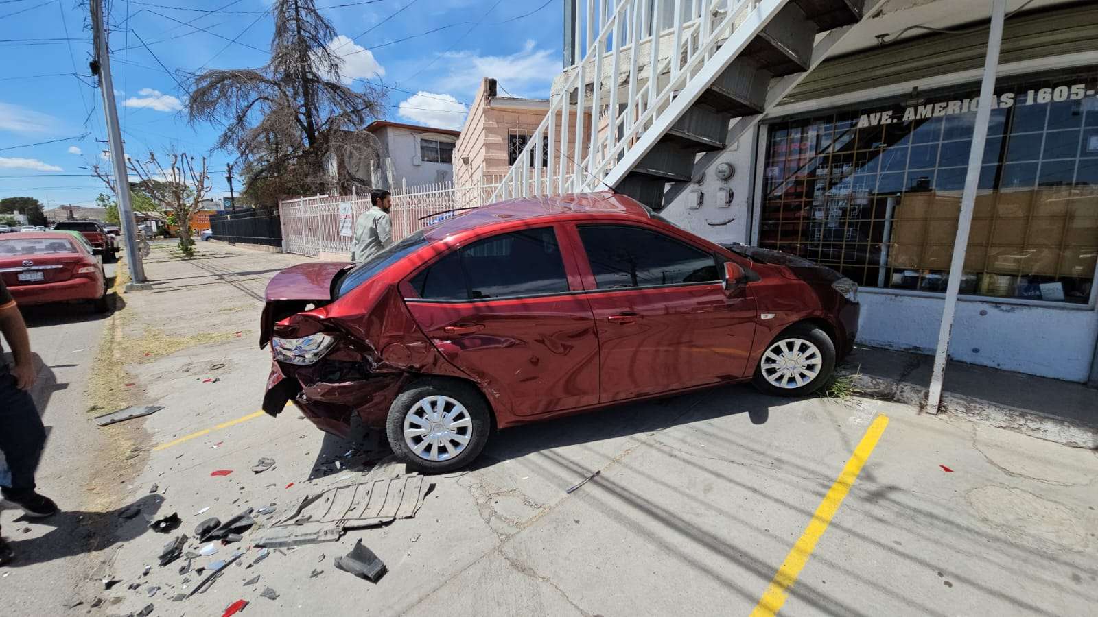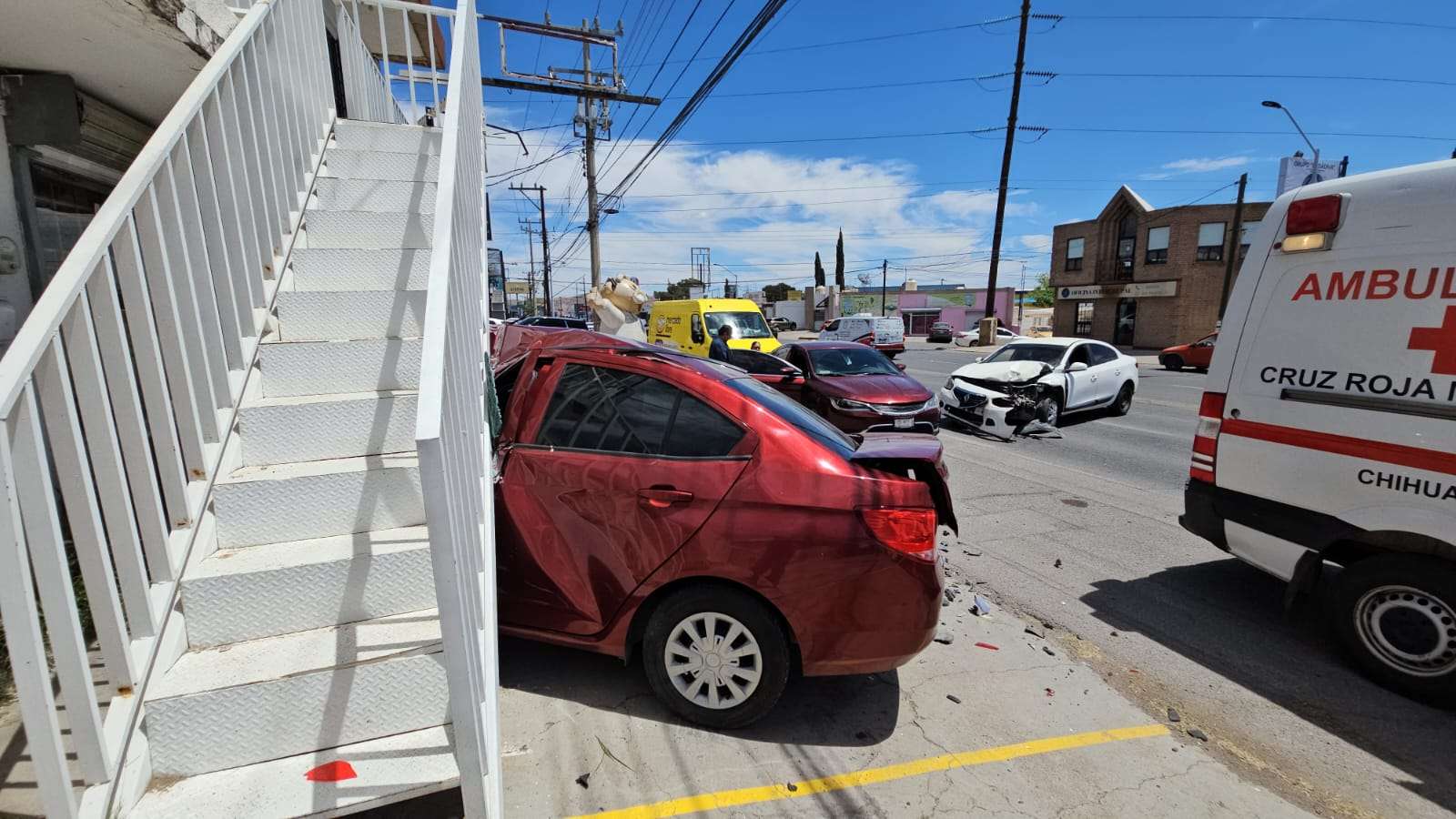 Tras el impacto, el Aveo fue empujado contra unas escaleras, quedando con pérdidas totales, mientras que los otros vehículos también presentaron daños de consideración.