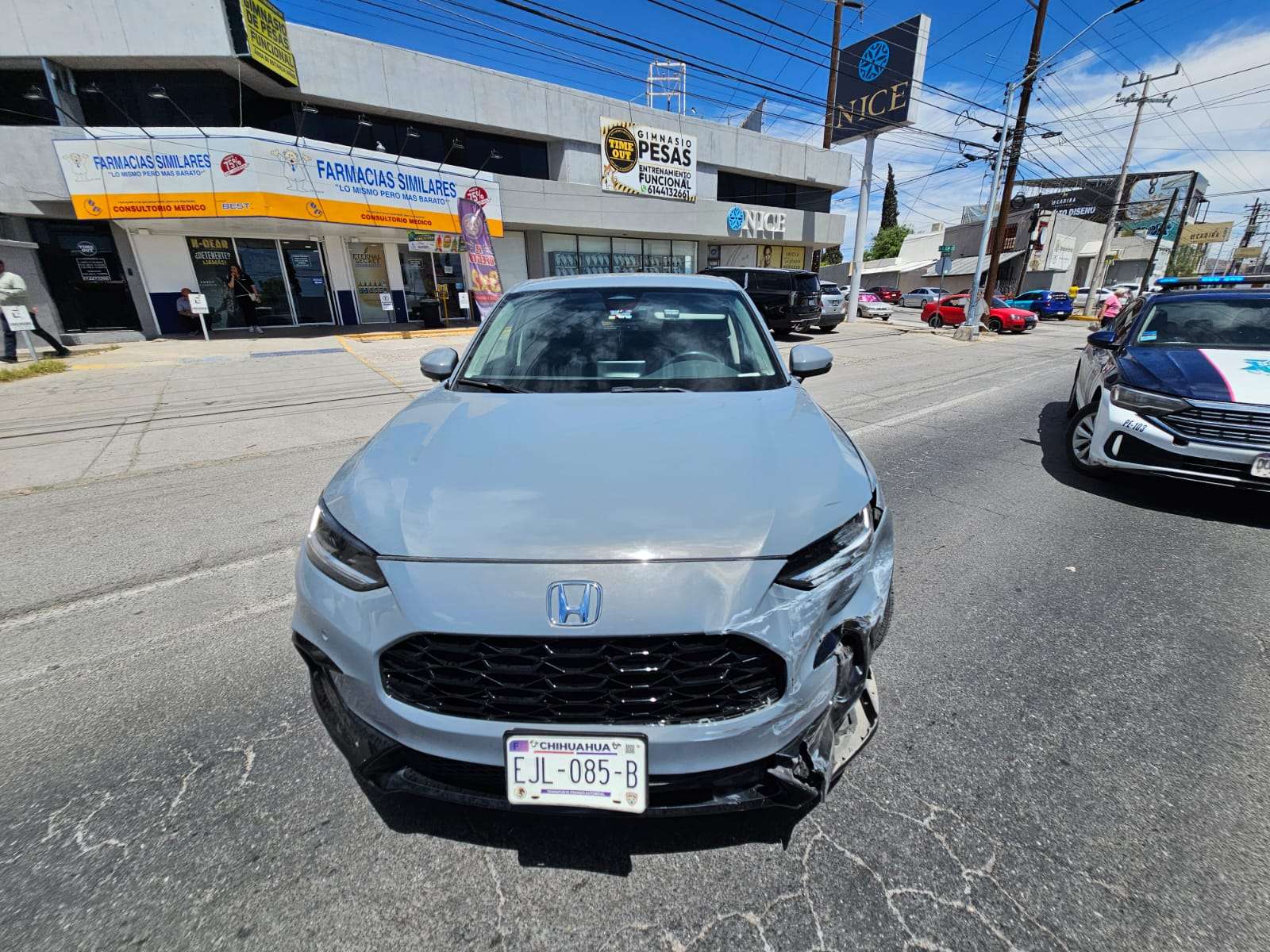Chihuahua.- La conductora de una camioneta Honda HR-V provocó un fuerte accidente luego de salir de un estacionamiento de Farmacias Similares, ubicado sobre la avenida De las Américas.