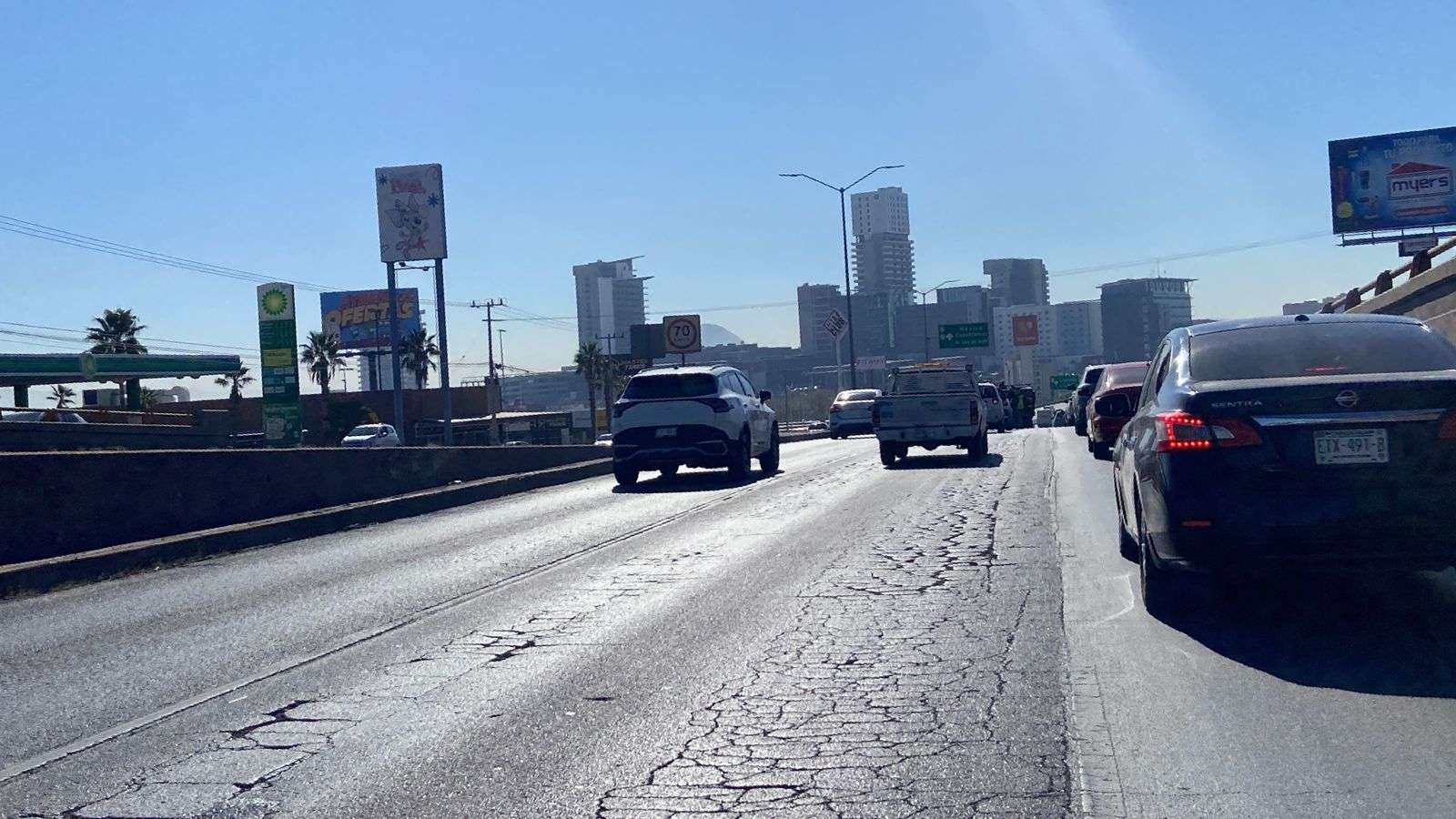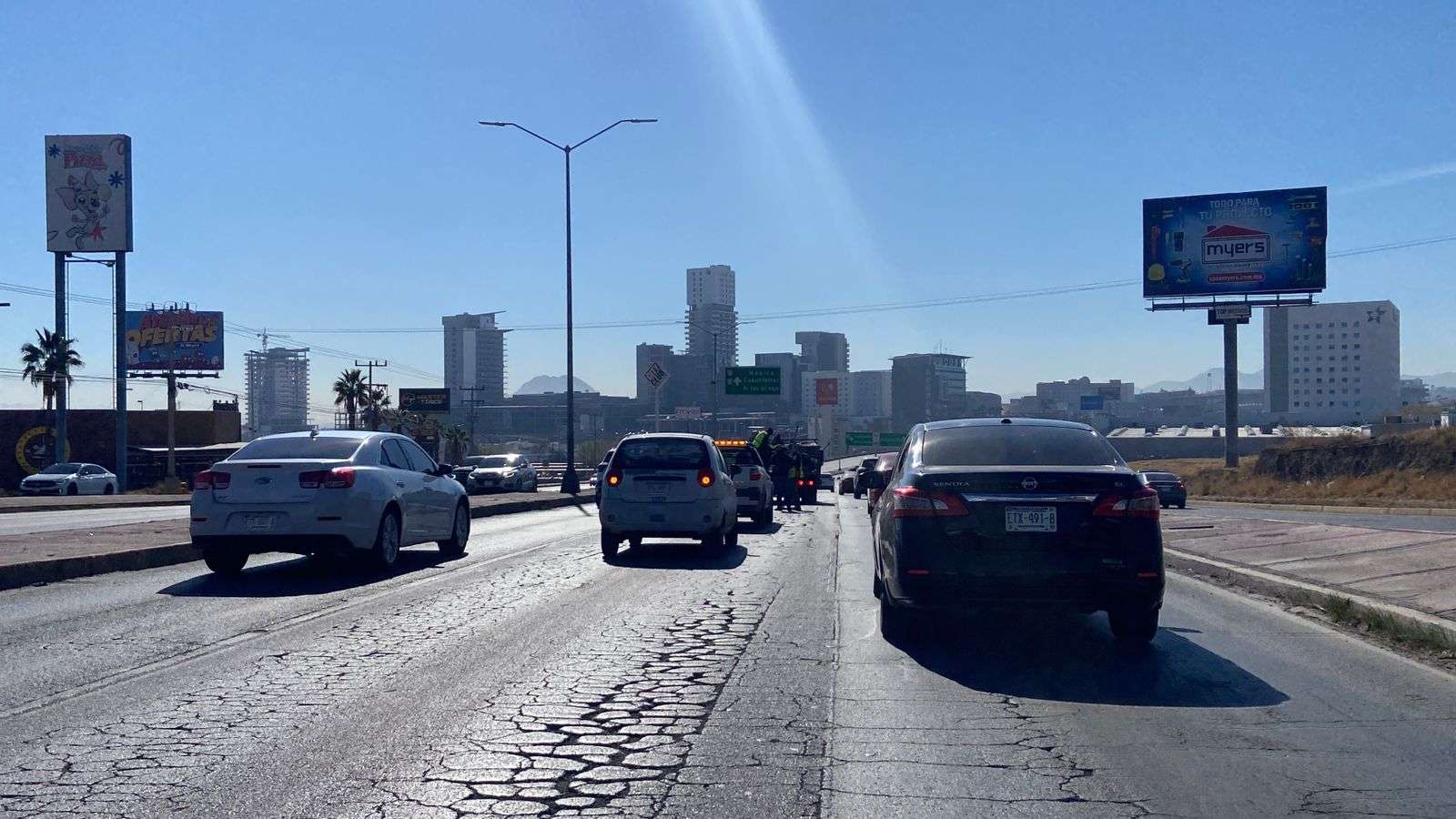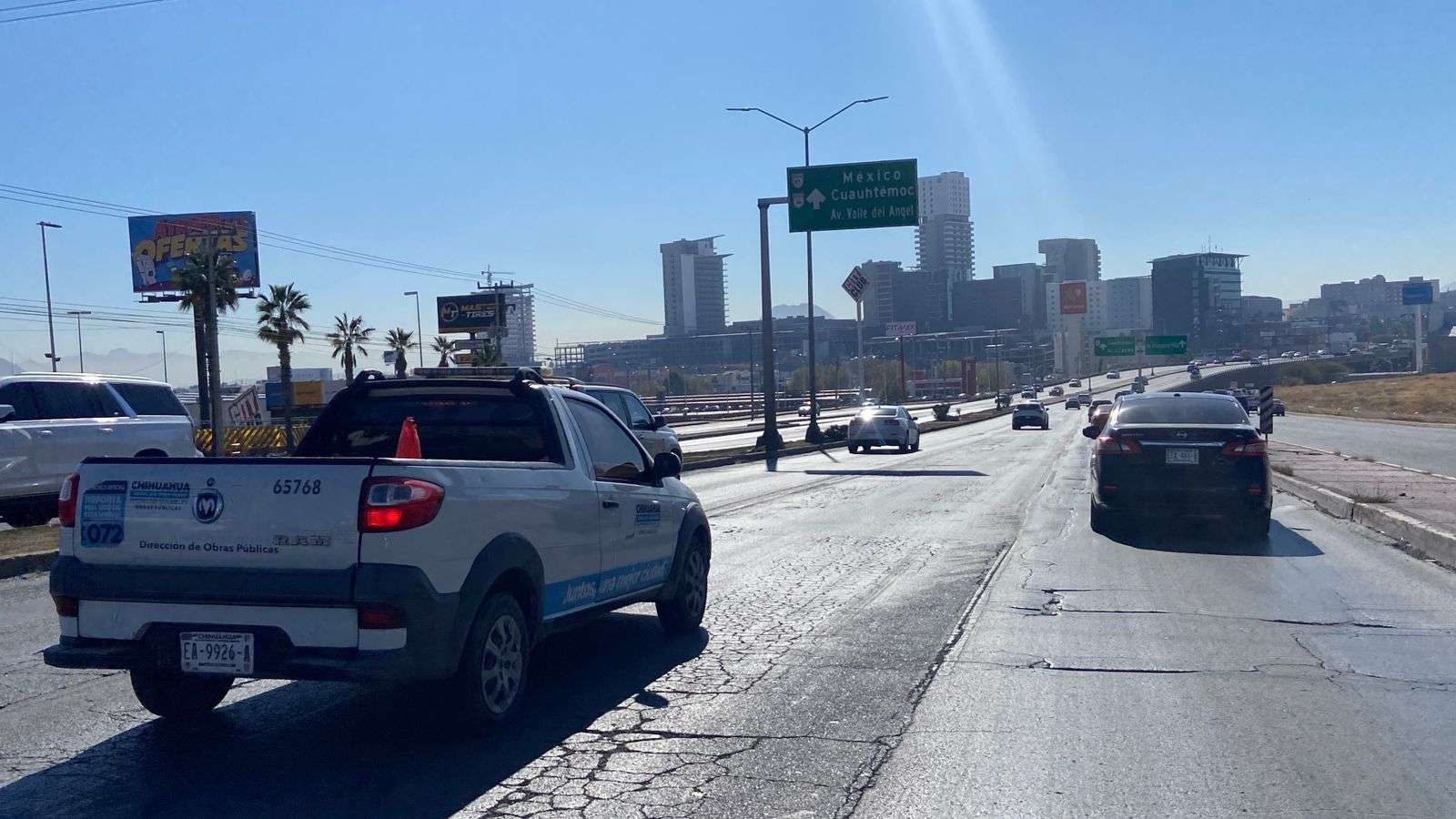 Chihuahua.- Esta tarde se registró un congestionamiento vial en el Periférico de la Juventud en el sentido de norte a sur, debido a los trabajos de bacheo que realiza la Dirección de Obras Públicas en los carriles centrales, a la altura del puente de la Juan Escutia.