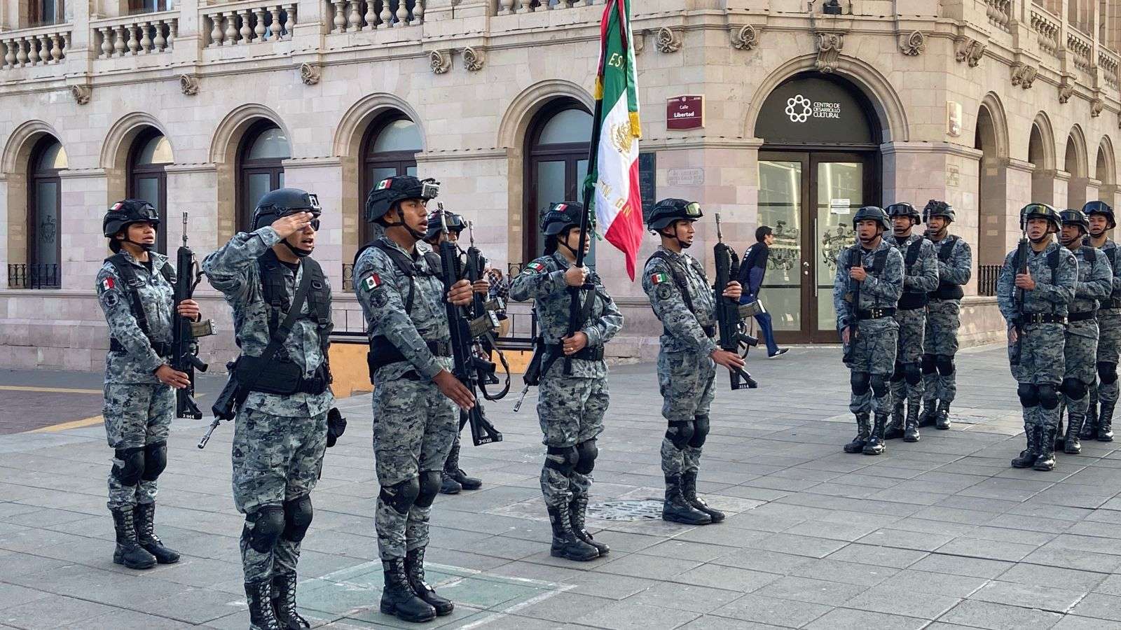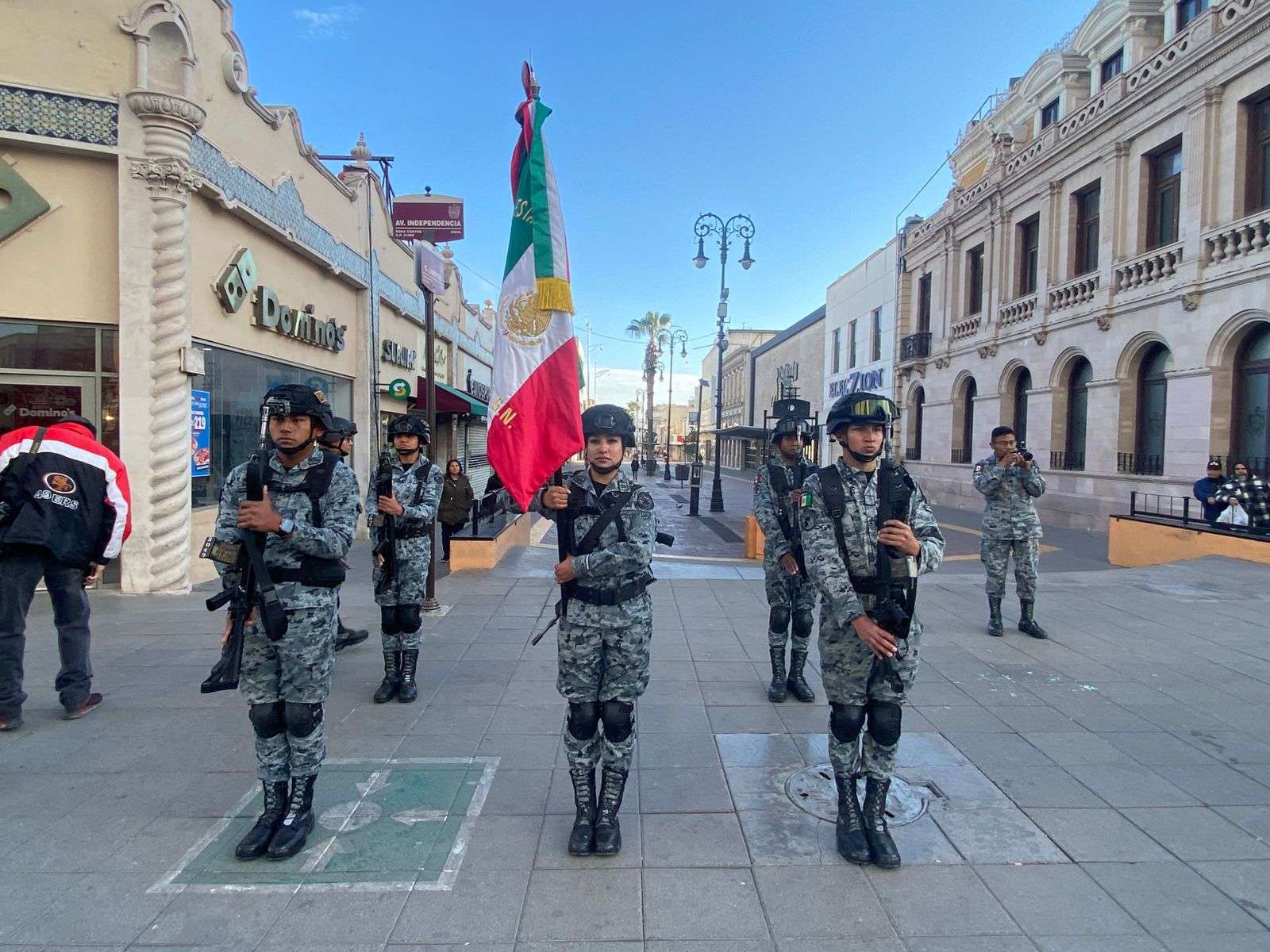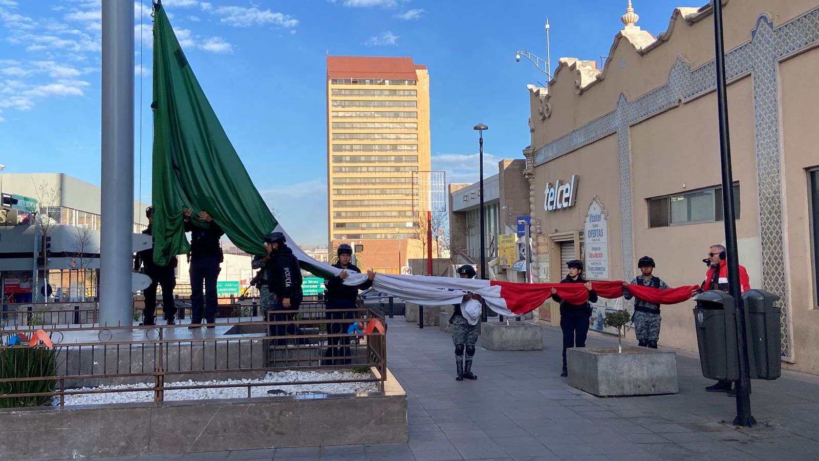 Chihuahua.– La Dirección de Seguridad Pública Municipal, en coordinación con la Guardia Nacional, realizó el izamiento de la bandera en la Plaza de Armas como parte del Lunes Cívico.