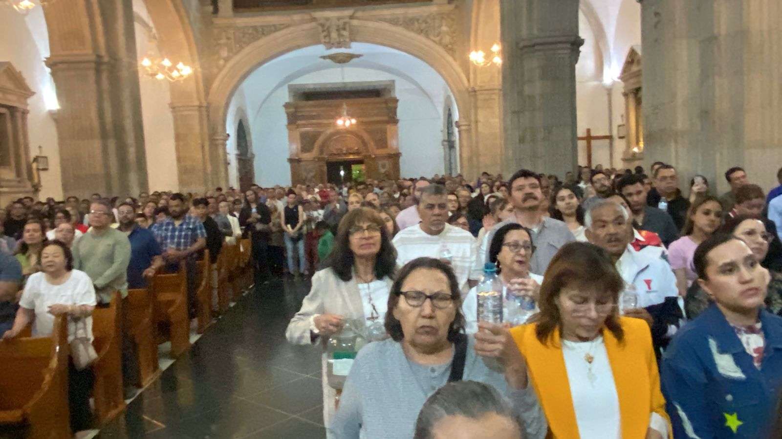 Antes de rociar con agua bendita a todos los feligreses, les renovó sus votos como cuando fueron bautizados y sus padres y padrinos hicieron los votos en nombre de ellos.