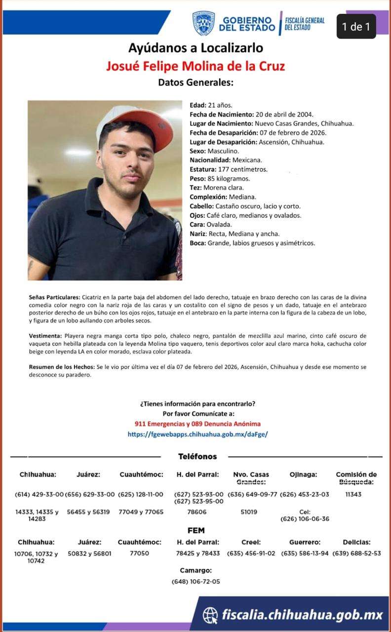 Al momento de su desaparición vestía playera negra tipo polo de manga corta, chaleco negro, pantalón de mezclilla azul marino, cinto café oscuro de vaqueta con hebilla plateada con la leyenda “Molina” tipo vaquero, tenis deportivos azul claro marca Hoka, cachucha beige con la leyenda “LA” en color morado y esclava plateada.