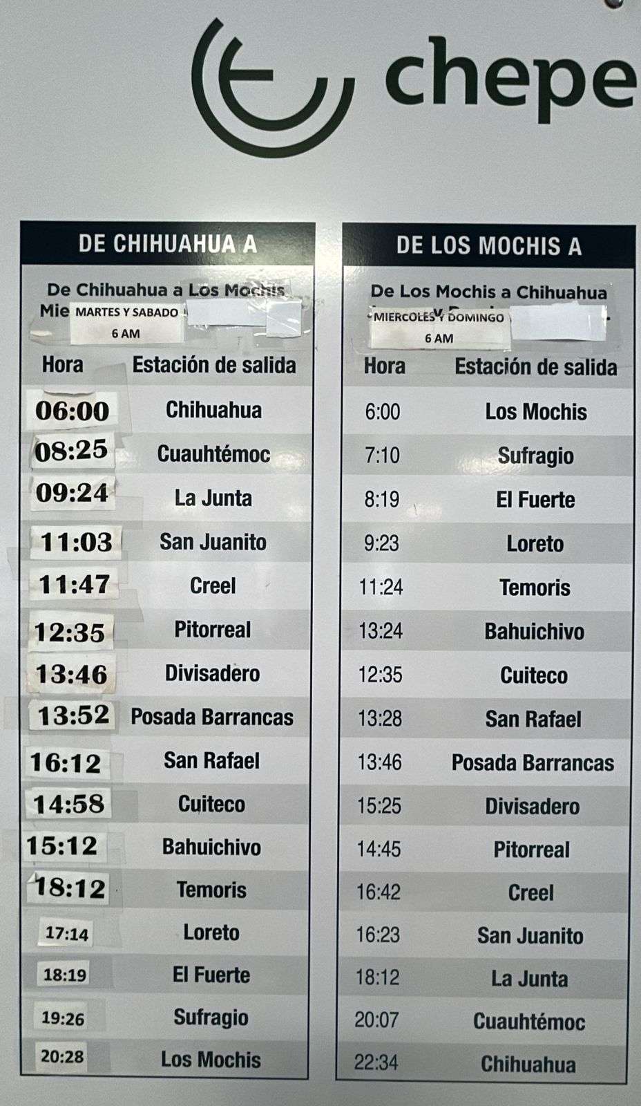 Mantiene el Chepe Regional sus salidas desde Chihuahua los días martes y sábado a las 06:00 horas, mientras que el retorno desde Los Mochis hacia la capital se realiza los miércoles y domingos, partiendo también a las 06:00 horas.