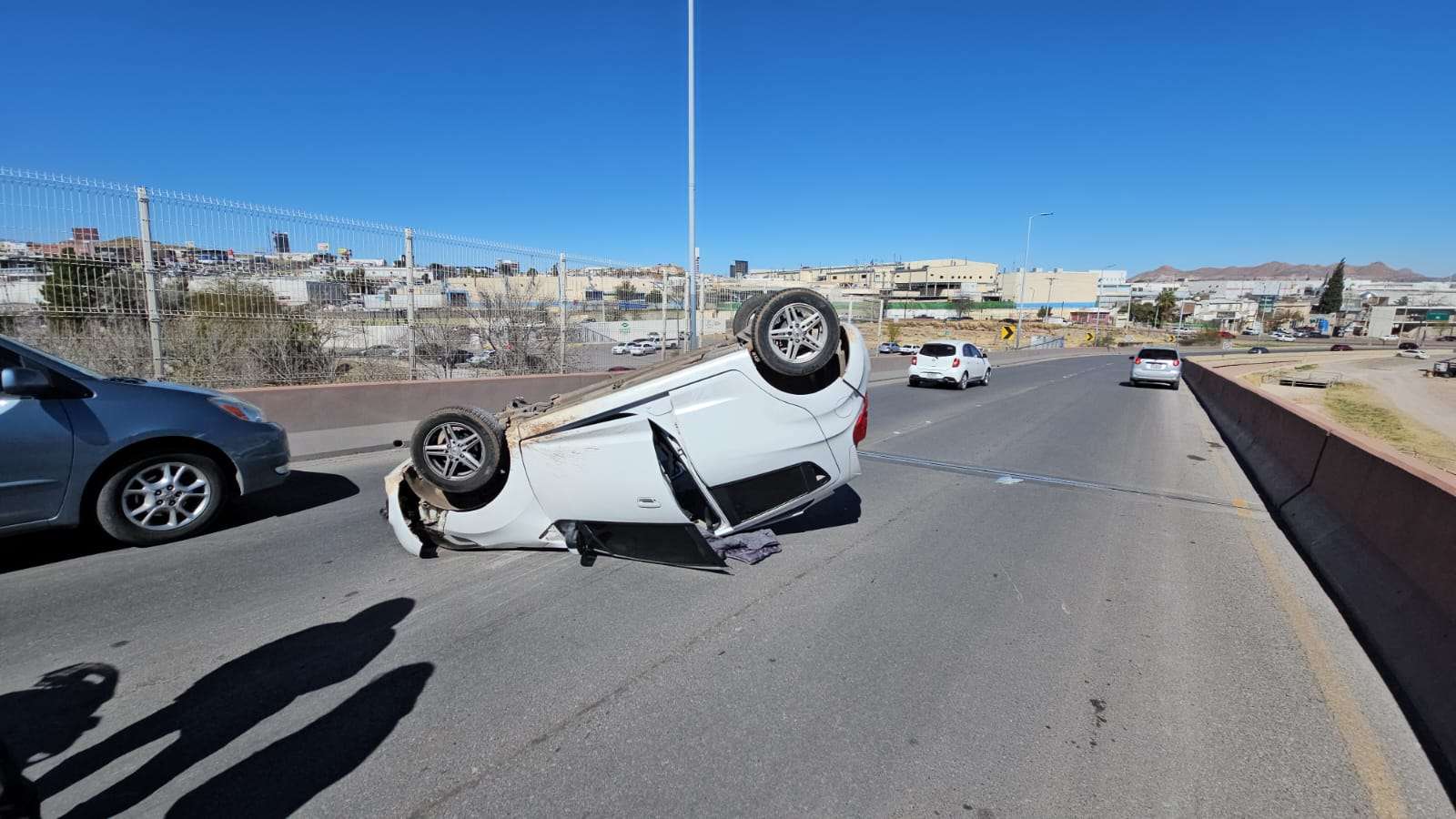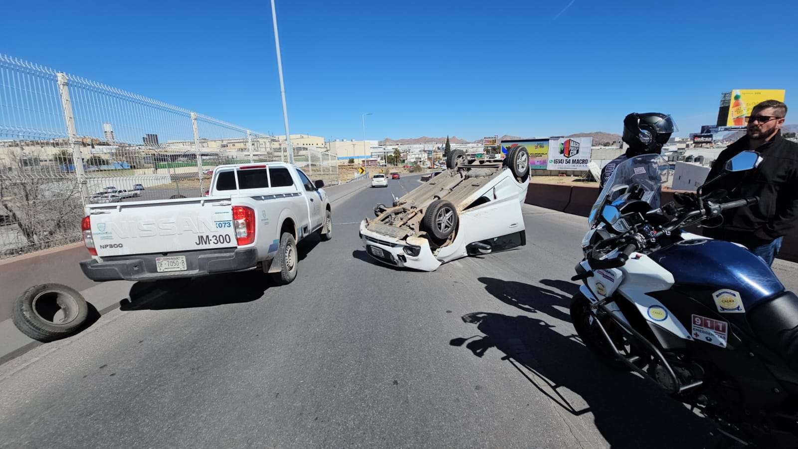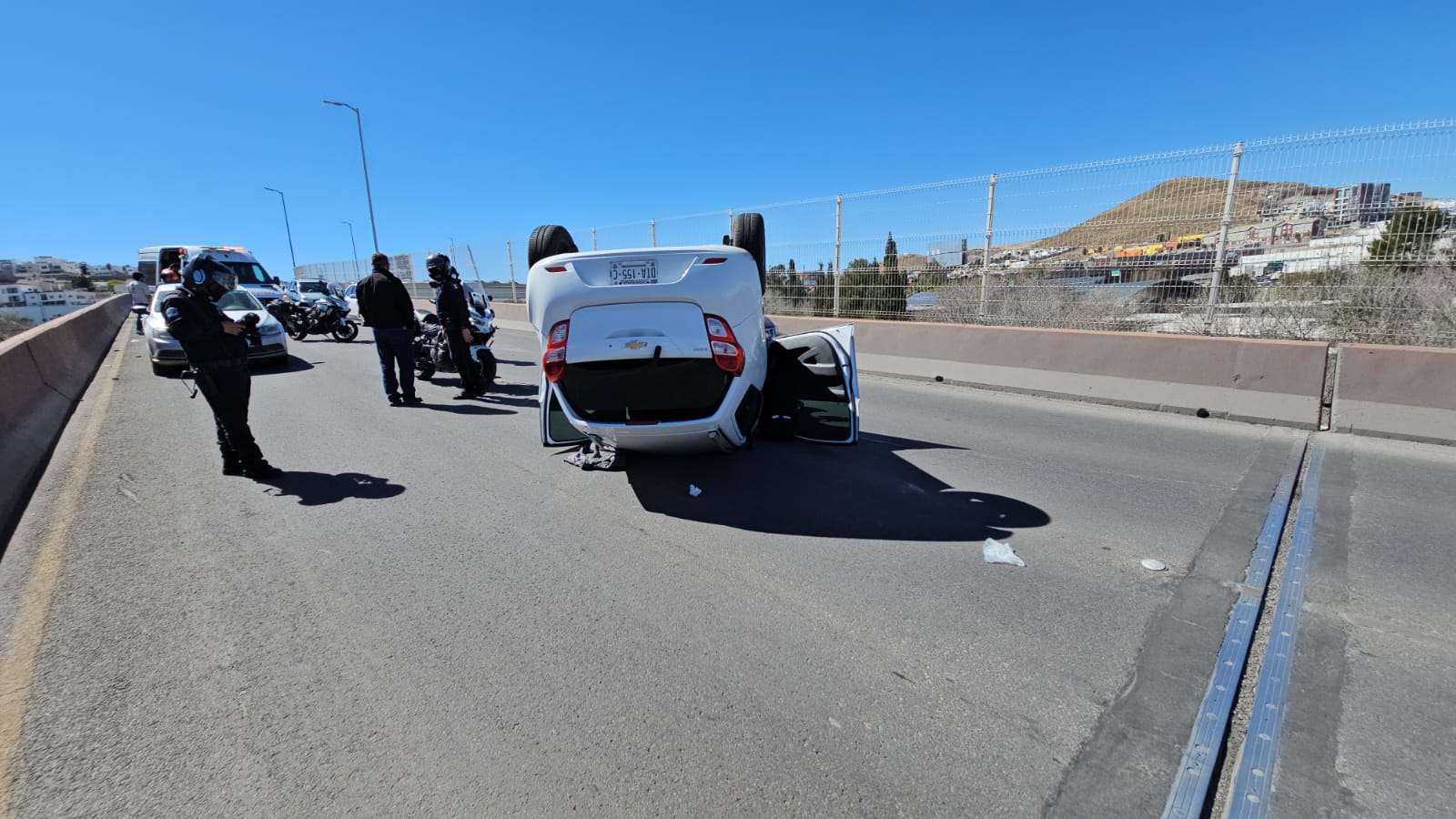 Chihuahua.- Un aparatoso accidente se registró en la gaza que conecta el Periférico de la Juventud con la avenida La Cantera, donde un vehículo terminó volcado, dejando a tres menores de edad lesionados.