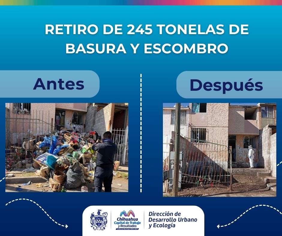 Chihuahua, Chih.- El Gobierno Municipal de Chihuahua, retiró un total de 245 toneladas de basura y escombro de una vivienda en la colonia Saucito, ya que esta casa contaba con un reporte de acumulación de residuos, los cuales ya causaban riesgos a la salud a los moradores del lugar.