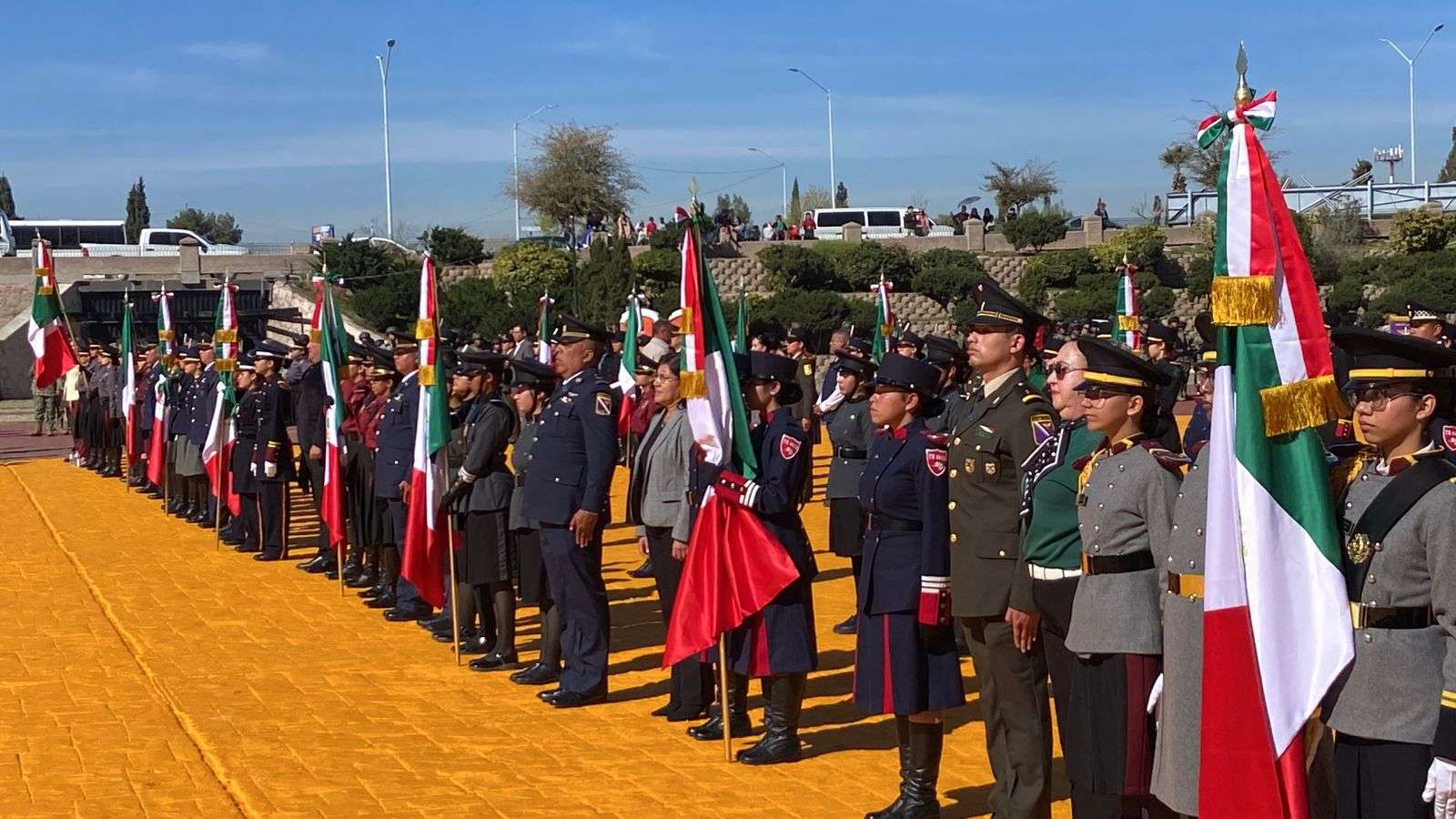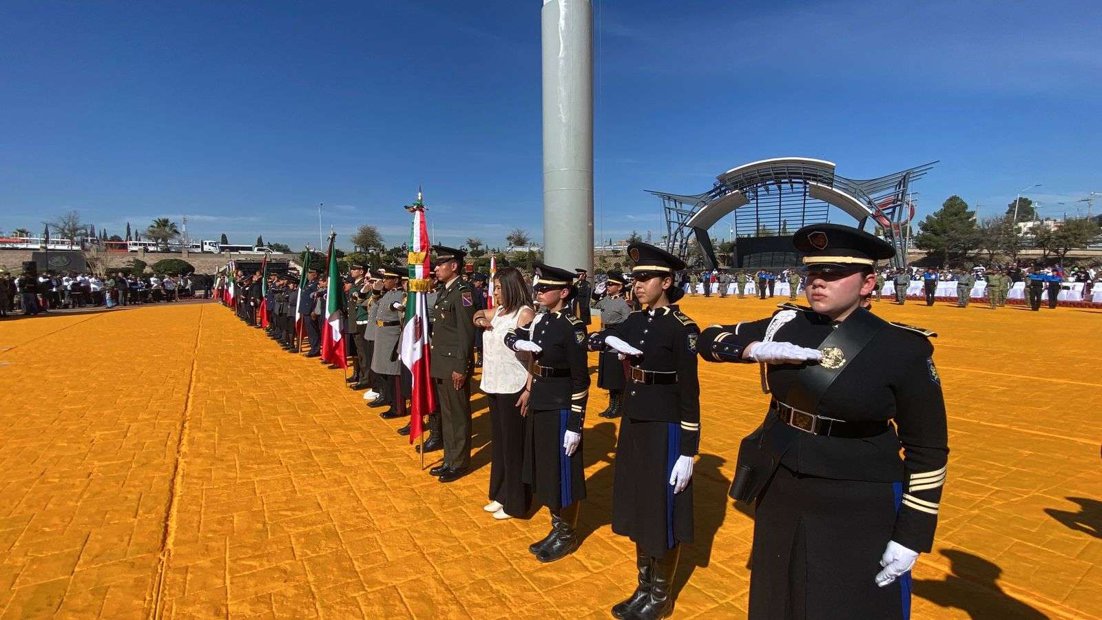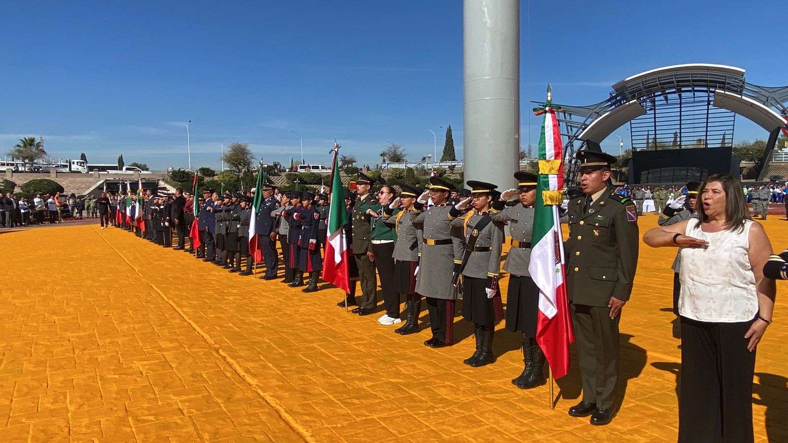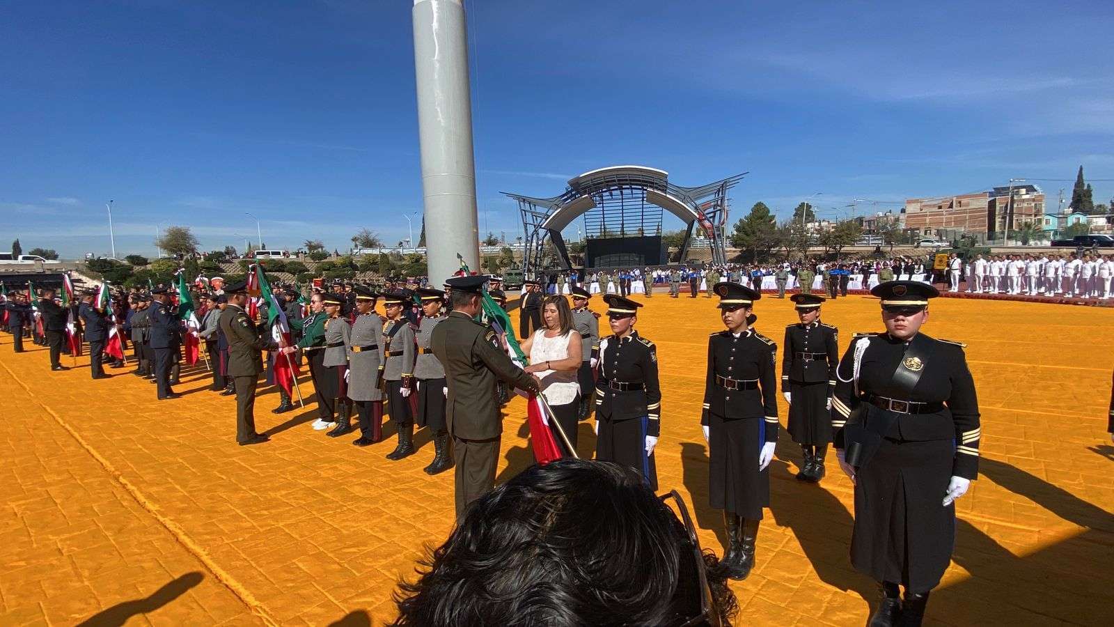 Chihuahua.- En el evento por el Día de la Bandera celebrado en el Palomar, la presidenta Claudia Sheinbaum realizó de manera remota la toma del juramento de bandera a las diferentes escoltas del país, incluyendo las de Chihuahua.