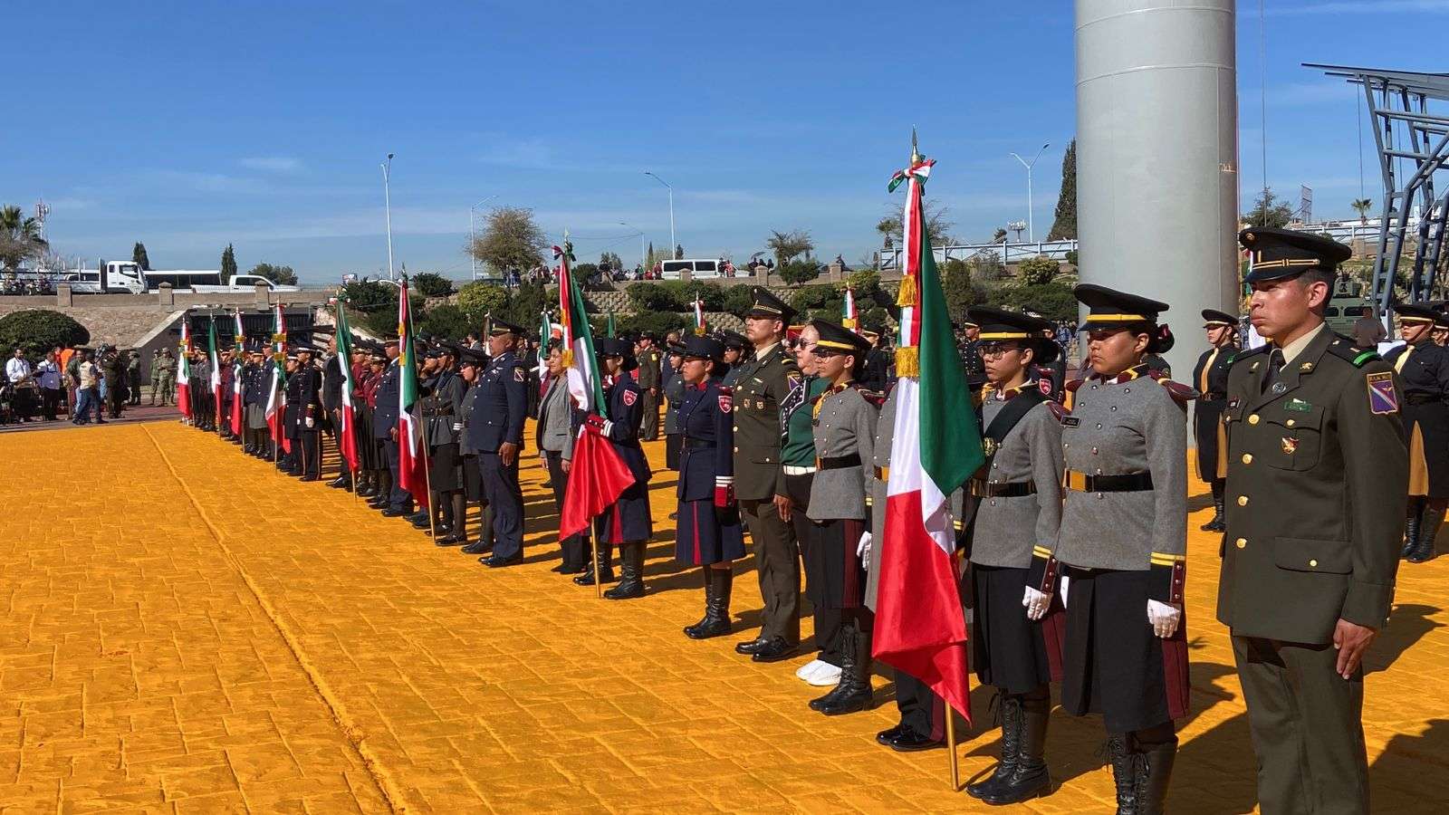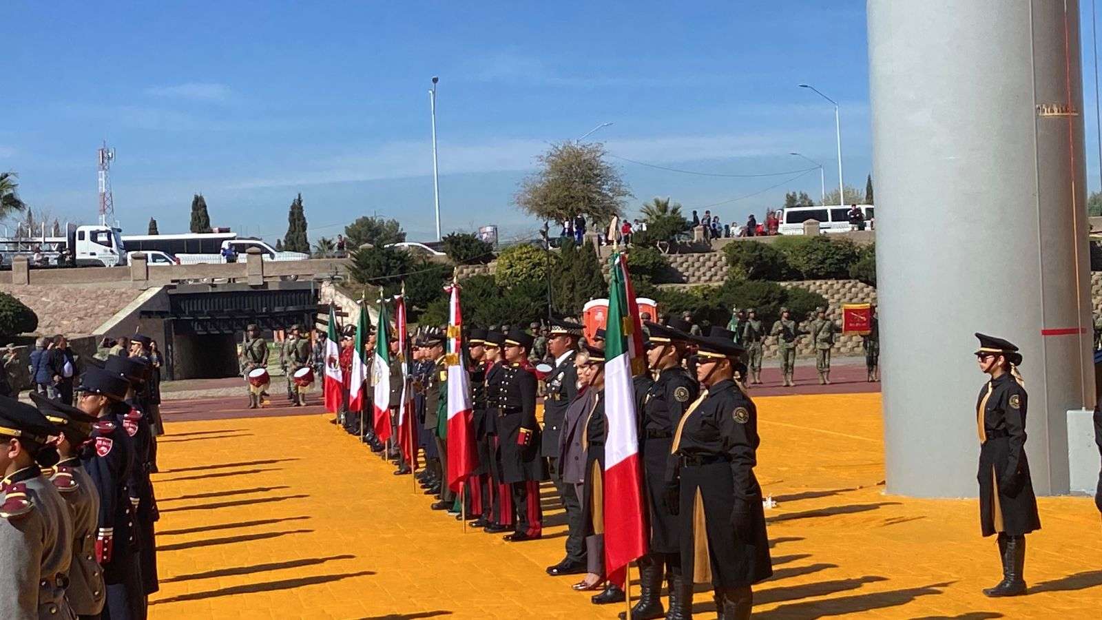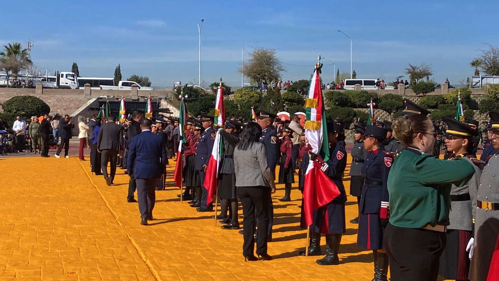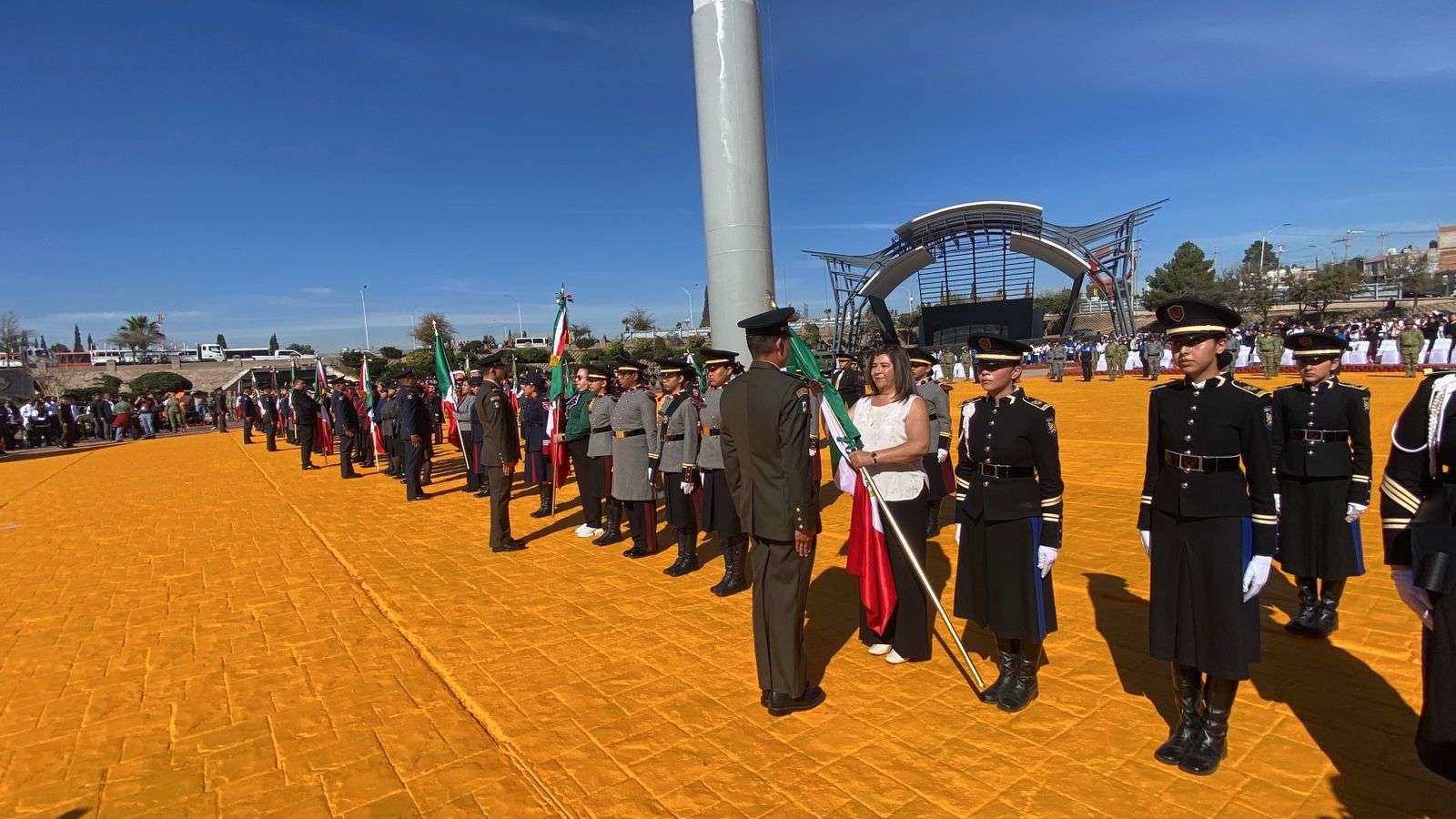 Chihuahua.- En el evento por el Día de la Bandera celebrado en el Palomar, la presidenta Claudia Sheinbaum realizó de manera remota la toma del juramento de bandera a las diferentes escoltas del país, incluyendo las de Chihuahua.