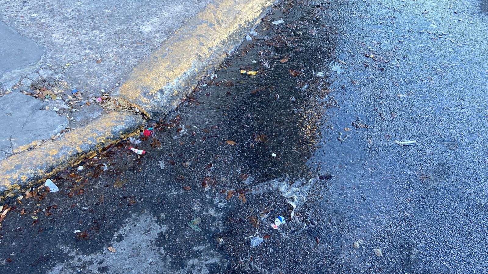 El desperfecto se presenta desde la guarnición de la banqueta, justo a un lado del Oxxo, y debido a la presión, el líquido ha corrido libremente por toda la calle, convirtiéndose en una trampa para quienes caminan por la zona.