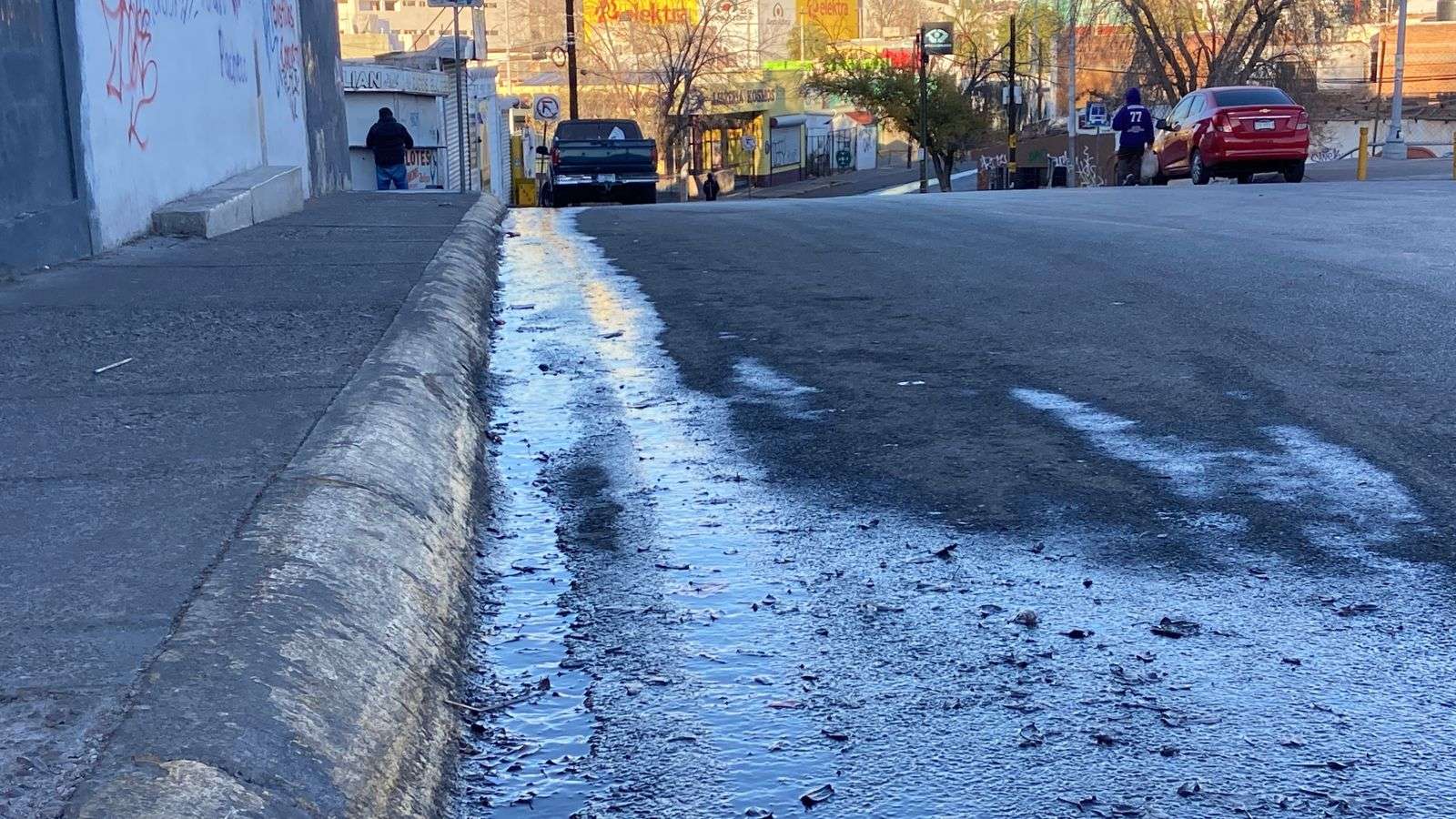 Chihuahua.– Una fuga de agua potable en la calle Josué Neri Santos, en la colonia Centro, ha provocado el desperdicio de miles de litros durante varios días, el agua recorre esta transitada vía y, con las bajas temperaturas, podría congelarse y causar algún accidente.