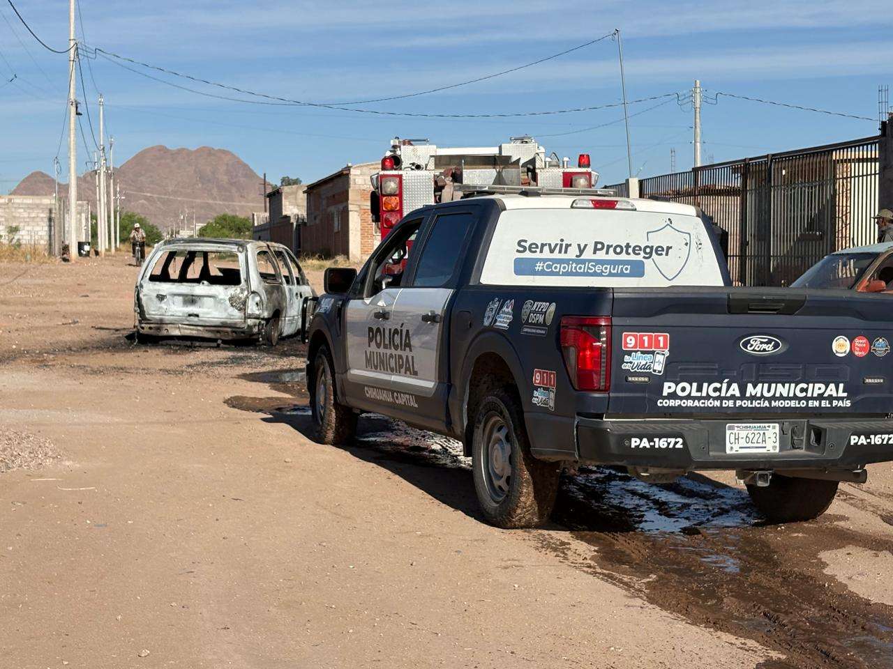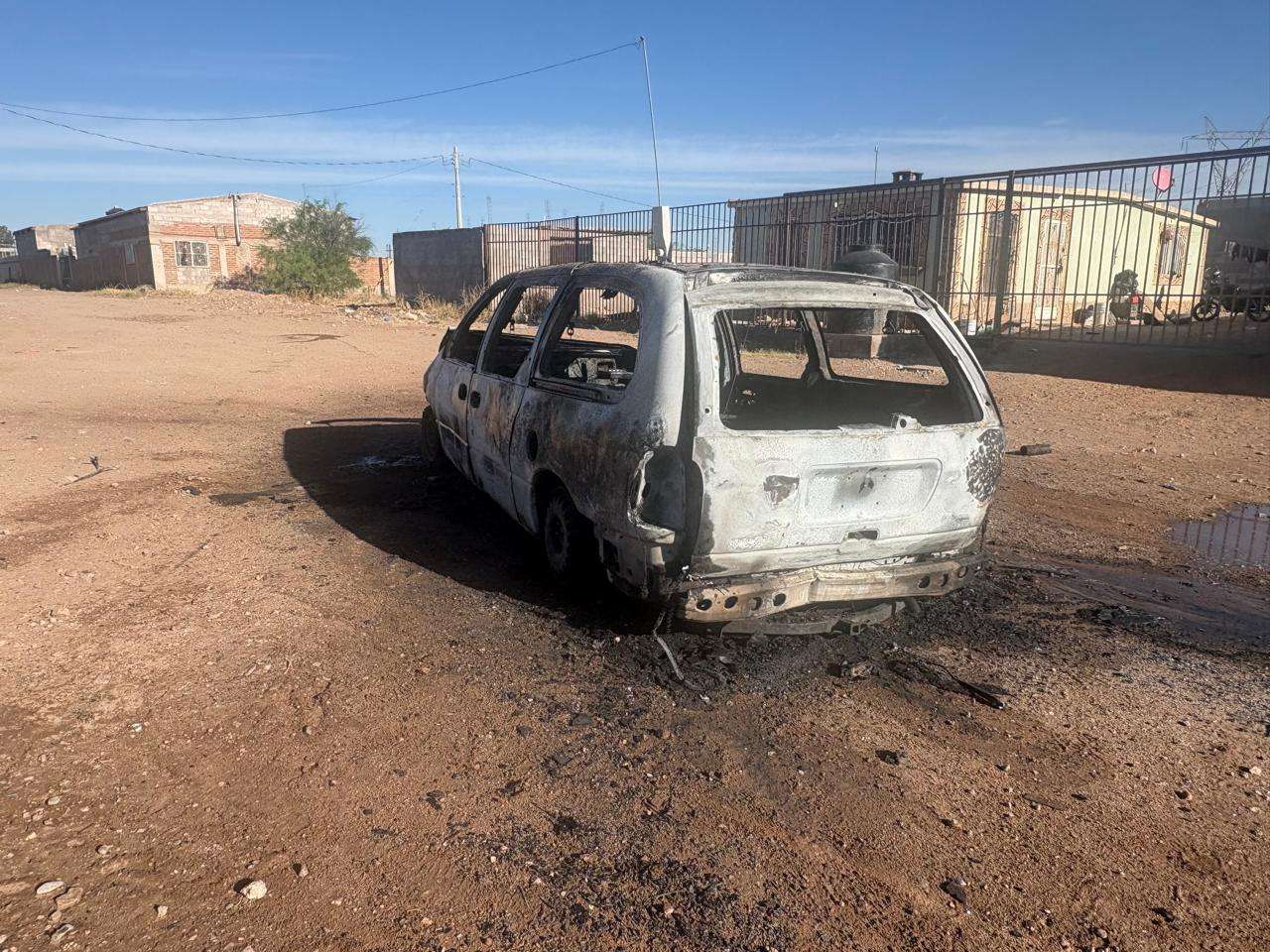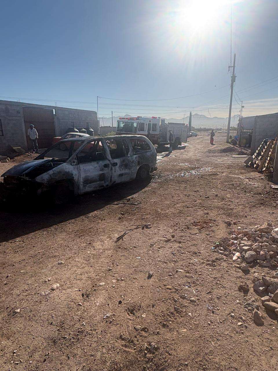Chihuahua.– Una camioneta tipo Dodge Caravan de color rojo quedó reducida a cenizas luego de sufrir una aparente falla mecánica que derivó en un incendio.