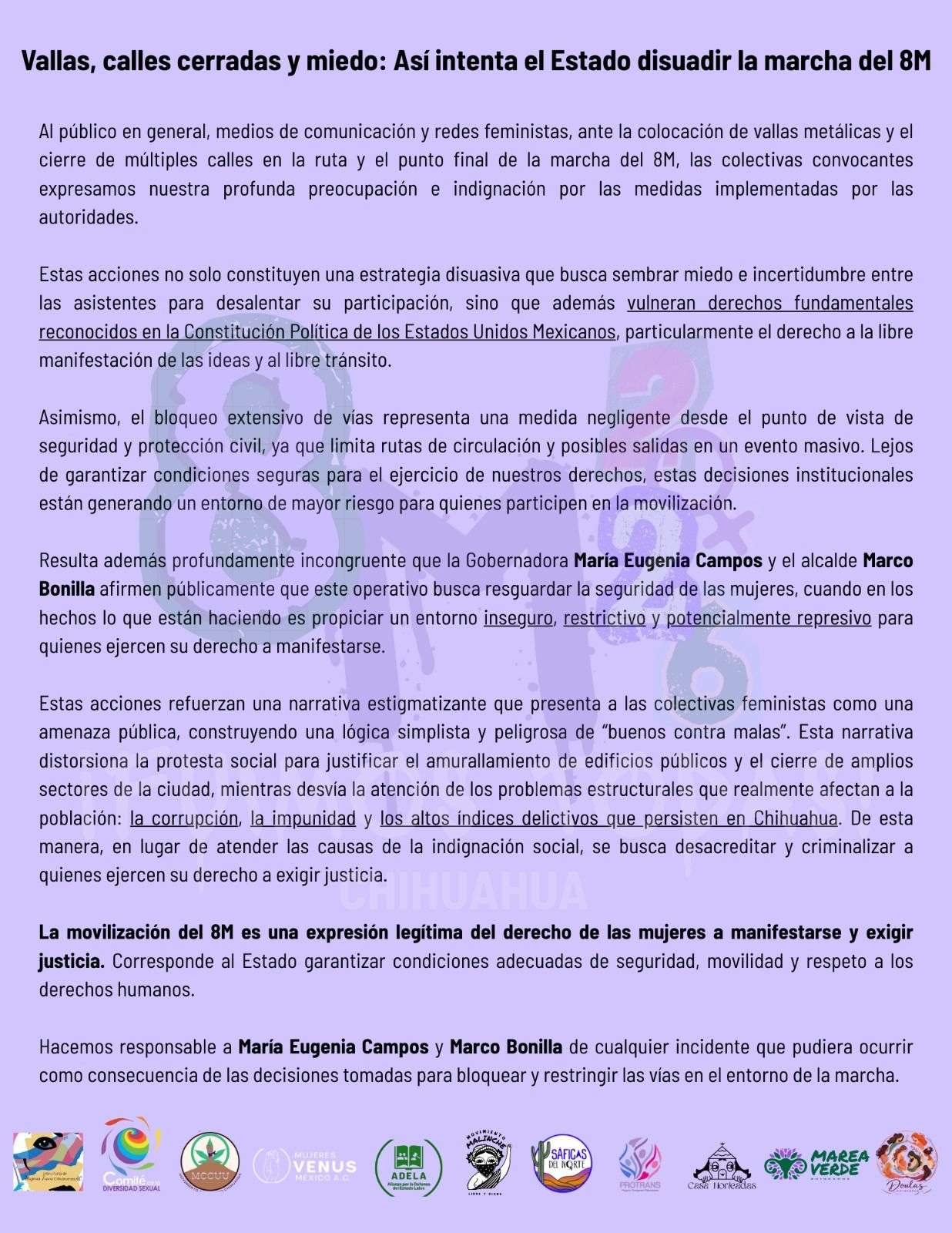 En su comunicado, los colectivos enfatizaron que la movilización del 8M es una expresión legítima del derecho de las mujeres a manifestarse y exigir justicia, y responsabilizaron a autoridades estatales y municipales de cualquier incidente que pudiese ocurrir como consecuencia de las decisiones tomadas para restringir el entorno de la marcha.