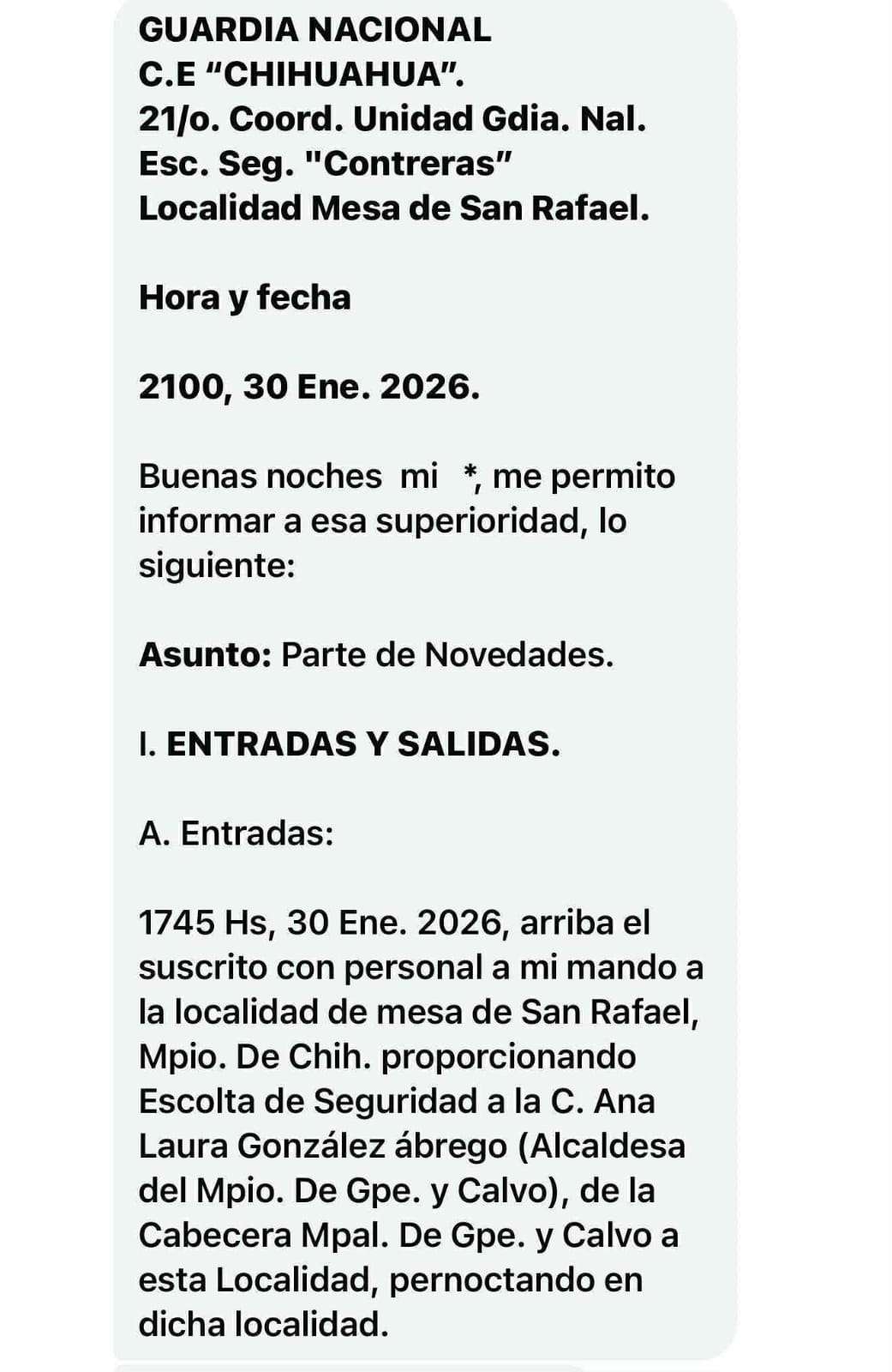 Hay el reporte de la 21º coordinador de la GN, de fecha 30 de enero, que a las 17:45 horas arribó junto con personal a la citada comunidad, proporcionando escolta a la presidenta de Guadalupe y Calvo, Ana Laura González Ábrego.