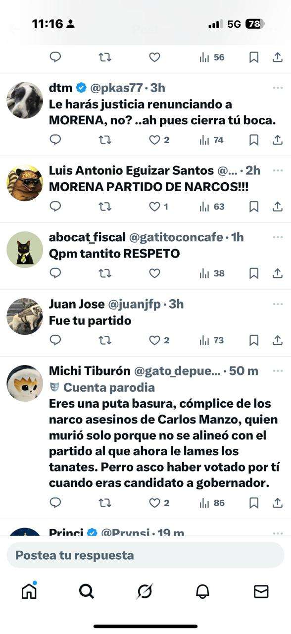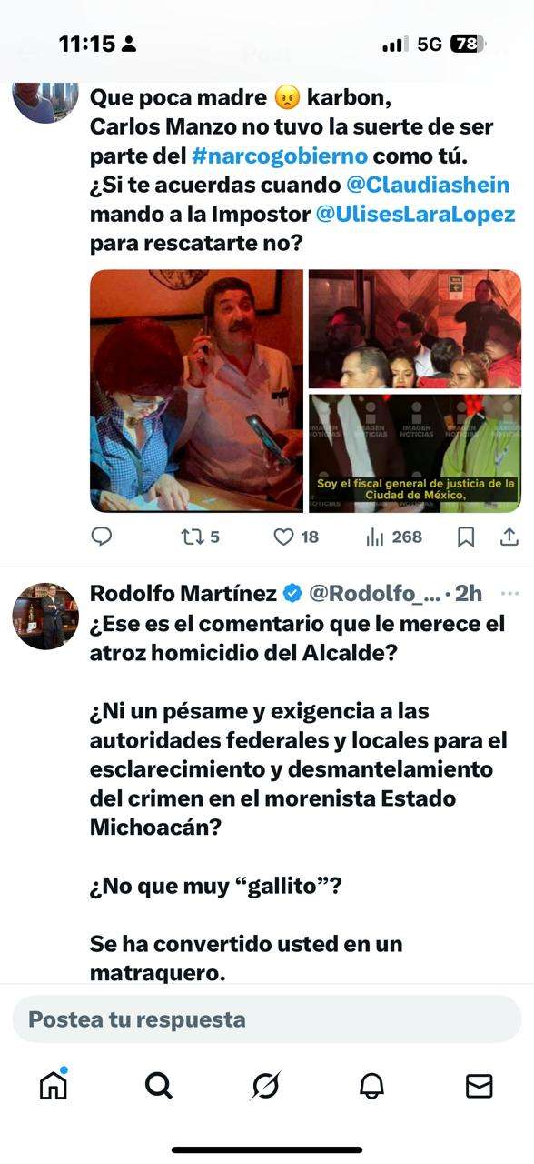 - "¿Ese es el comentario que le merece el atroz homicidio del Alcalde? ¿Ni un pésame y exigencia a las autoridades federales y locales para el esclarecimiento y desmantelamiento del crimen en el morenista Estado Michoacán? ¿No que muy “gallito”? Se ha convertido usted en un matraquero".
