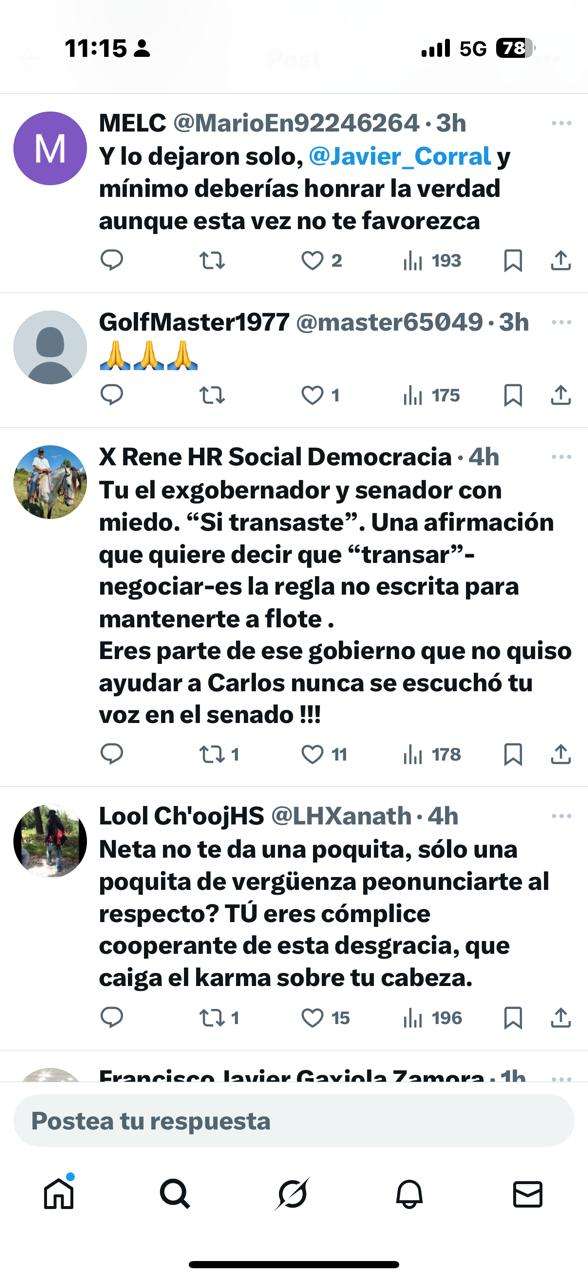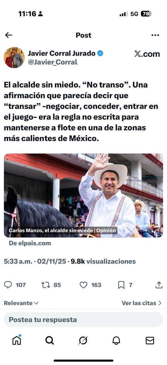 Chihuahua.- Luego del asesinato de Carlos Manzo, alcalde de Uruapan, Michoacán, Javier Corral reaccionó con el siguiente comentario que le costó una verdadera tunda en redes: "El alcalde sin miedo. “No transo”. Una afirmación que parecía decir que “transar” -negociar, conceder, entrar en el juego- era la regla no escrita para mantenerse a flote en una de la zonas más calientes de México", dijo el exmandatario estatal en X.