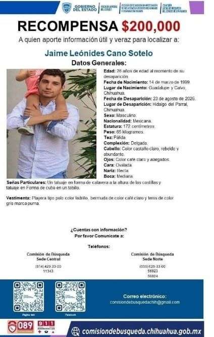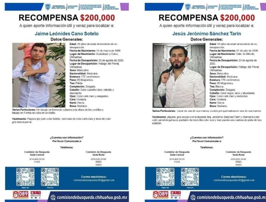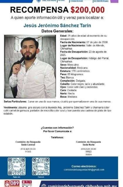 Chihuahua.- El fiscal de la Zona Sur, Guillermo Hinojos Hinojos, informó que ya existen dos personas vinculadas a proceso relacionadas con la desaparición de Jesús Jerónimo Sánchez Tarín, joven privado de la libertad el pasado 23 de agosto de 2025 en el municipio de Parral.