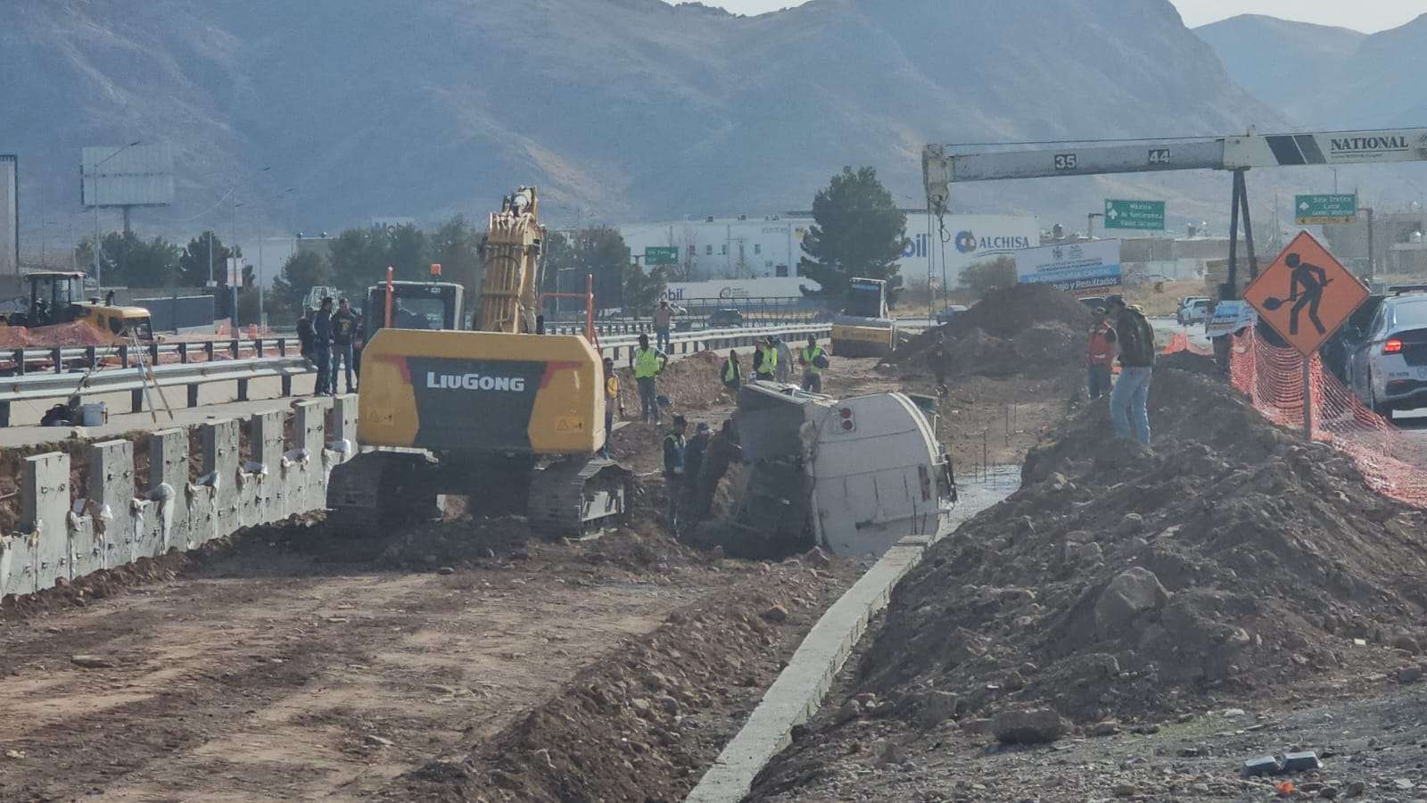Chihuahua.- Una pipa cargada con varios litros de agua volcó sobre su costado izquierdo dentro de la construcción del puente ubicado en el cruce de la avenida de las Industrias y la vialidad de Los Nogales.