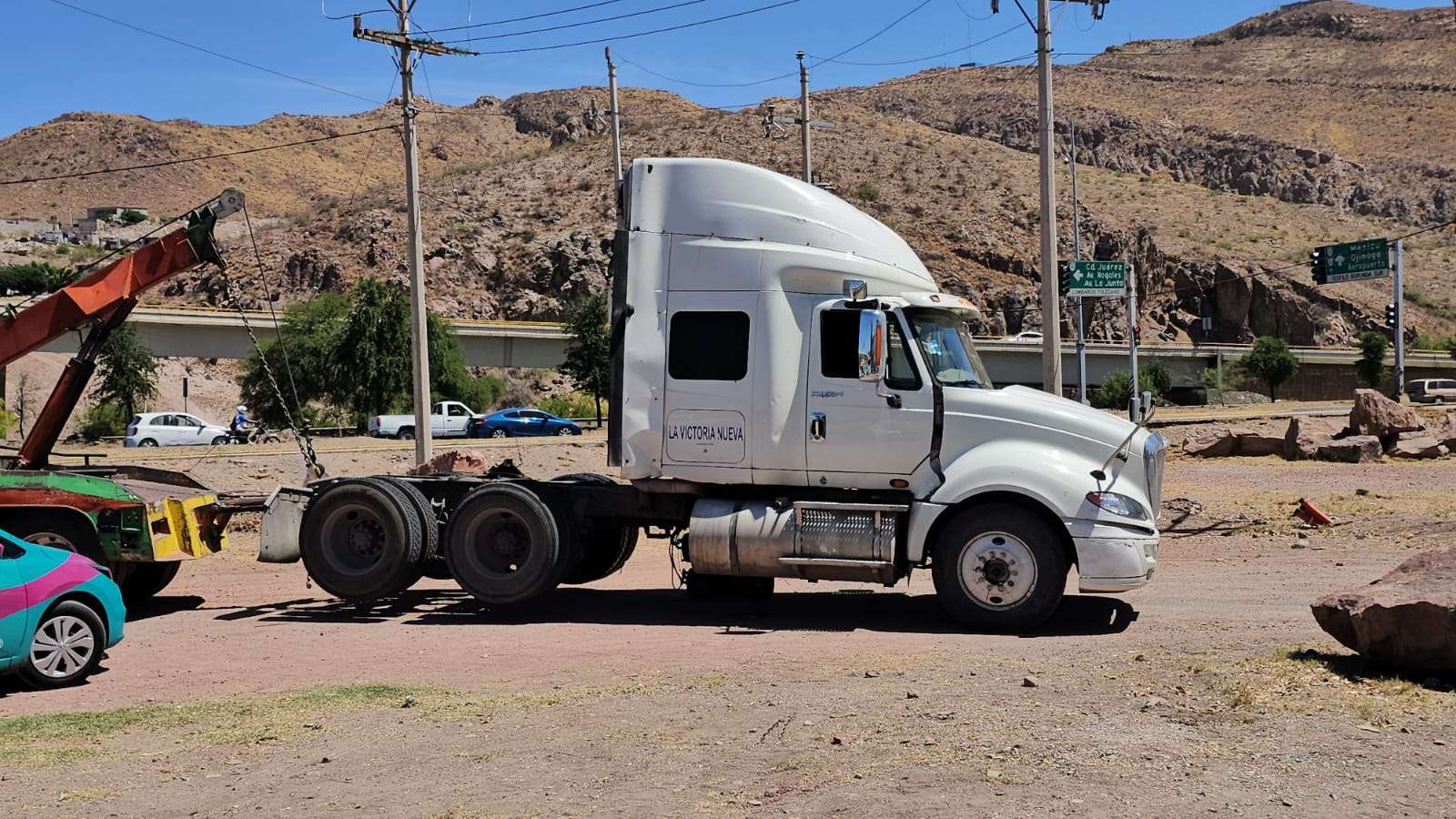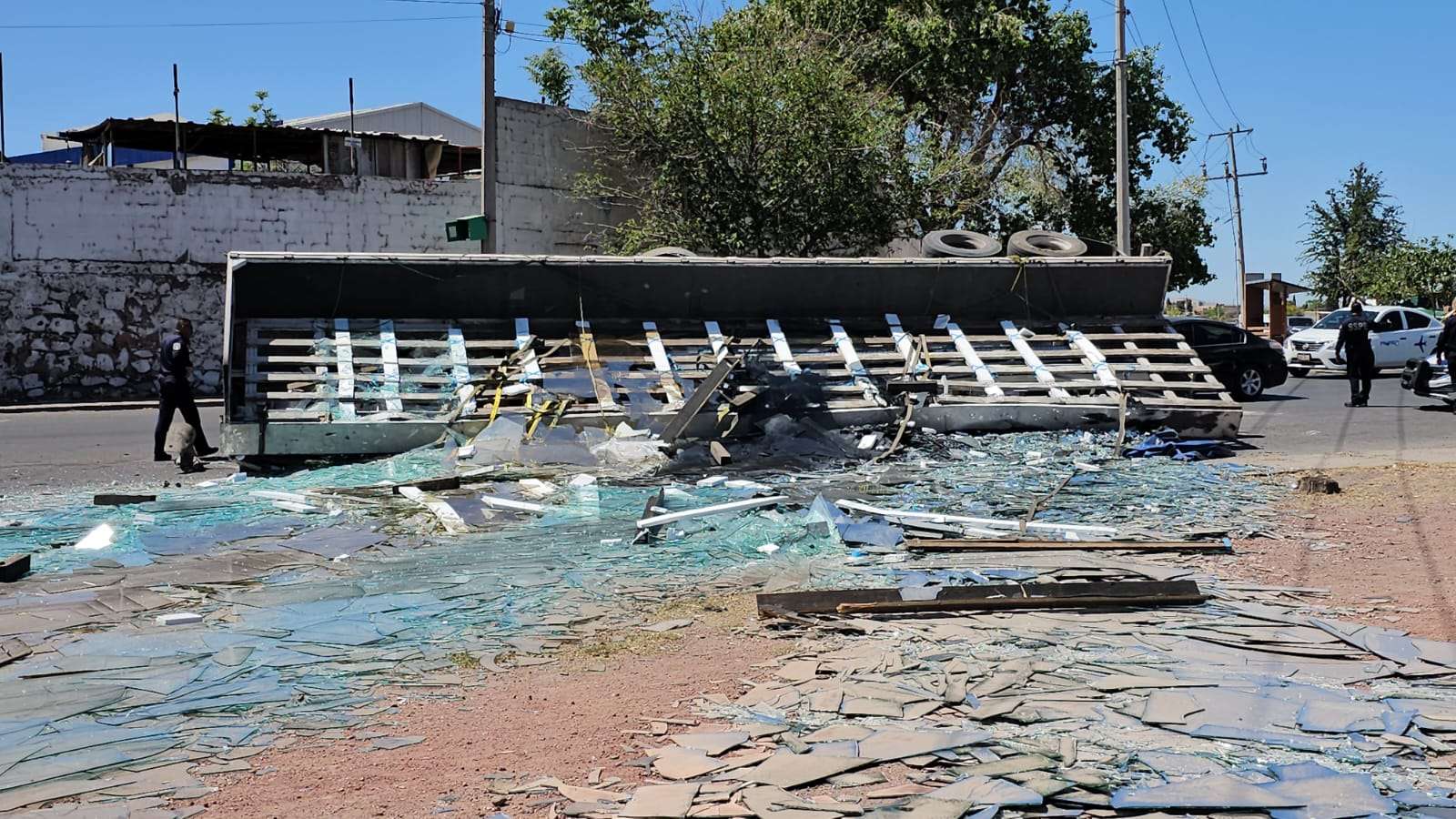 Chihuahua.- Un tráiler que transportaba espejos volcó en la intersección de la avenida Teófilo Borunda, cuando intentaba incorporarse hacia el periférico Lombardo Toledano.