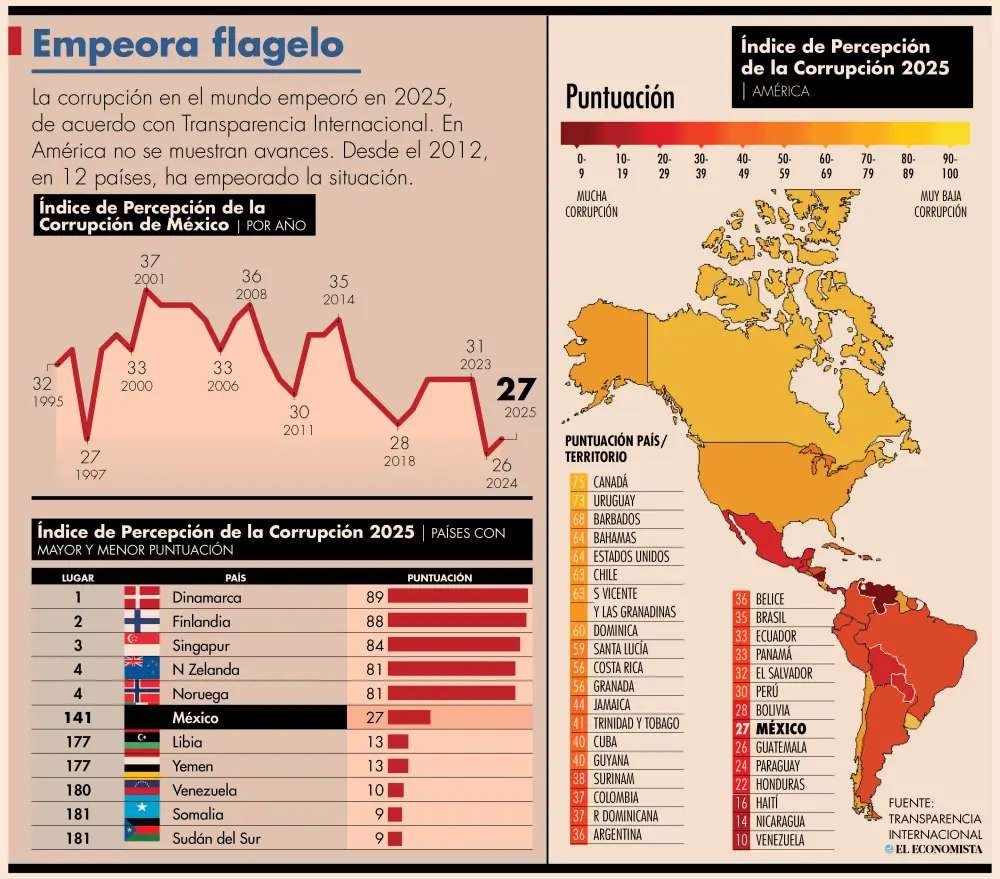 De manera general, el reporte indicó que la corrupción empeoró en todo el mundo en esta edición, confirmó que el número de países con puntuación superior a 80 se redujo de 12 hace una década a solo cinco en 2025