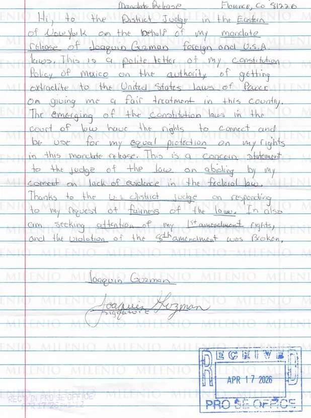 “Esta es una carta cortés de la Constitución Política de México sobre la autoridad y las leyes de los Estados Unidos sobre mi extradición para darme un trato justo en este país. La aparición de las leyes constitucionales en la corte tiene el derecho a que sean conectadas y usadas para una protección igualitaria de mis derechos sobre este mandato”, escribió Guzmán Loera en una carta escrita el pasado 10 de abril y que fue presentada oficialmente en la corte neoyorquina este 17 de abril.