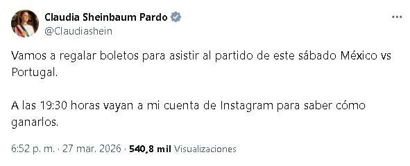 México.- La presidenta Claudia Sheinbaum dio a conocer que regalará boletos para el partido de futbol que disputarán este sábado las selecciones nacionales de México y Portugal a las 19:00 horas en el estadio Azteca.